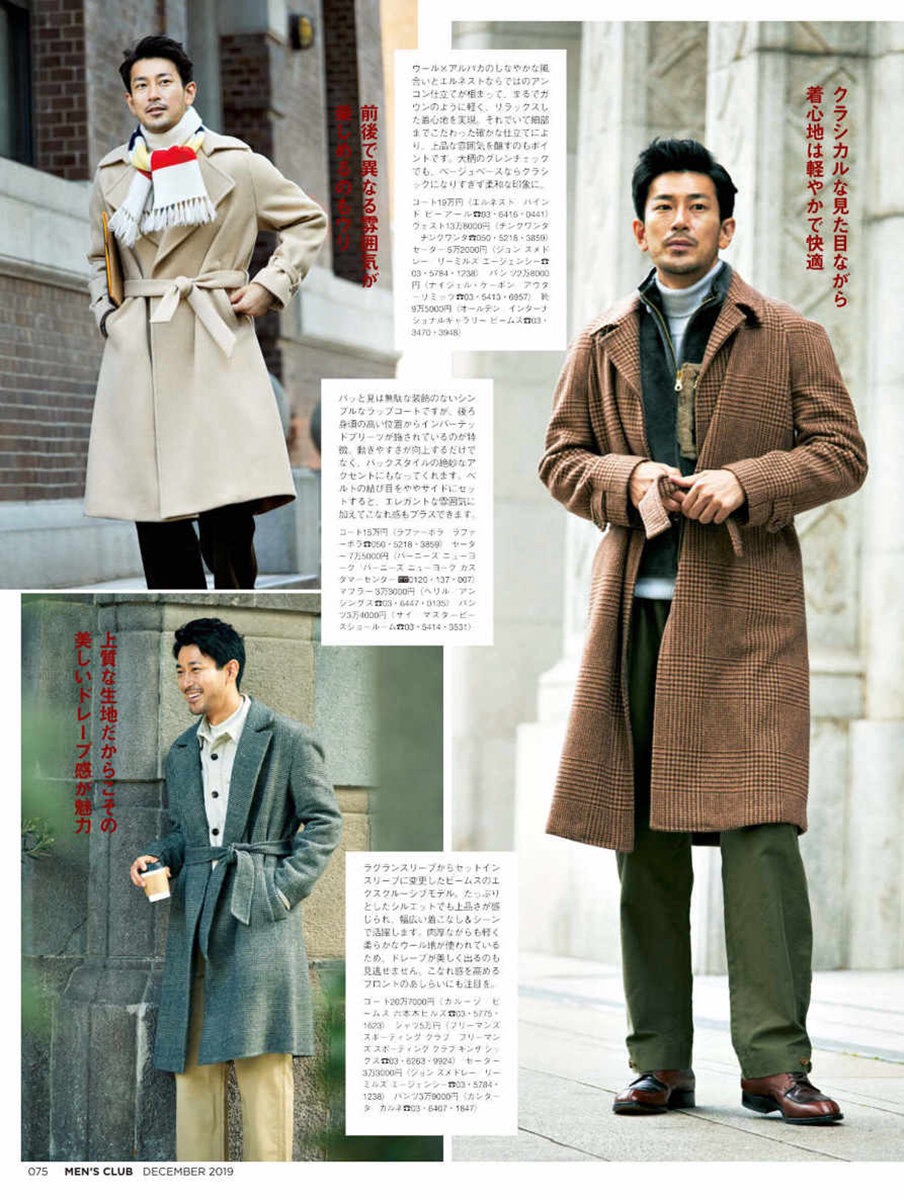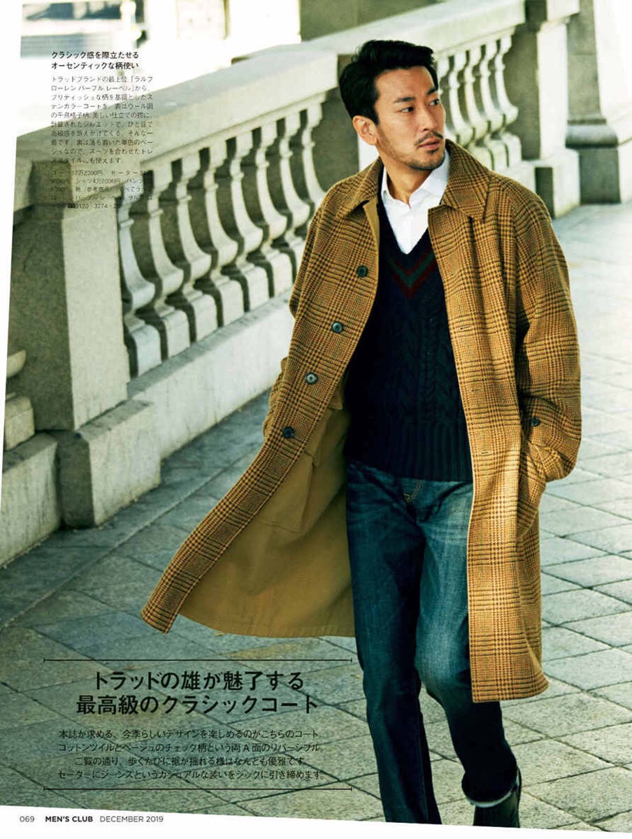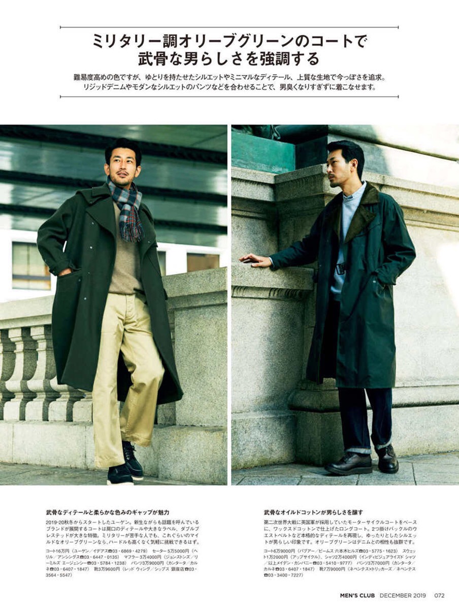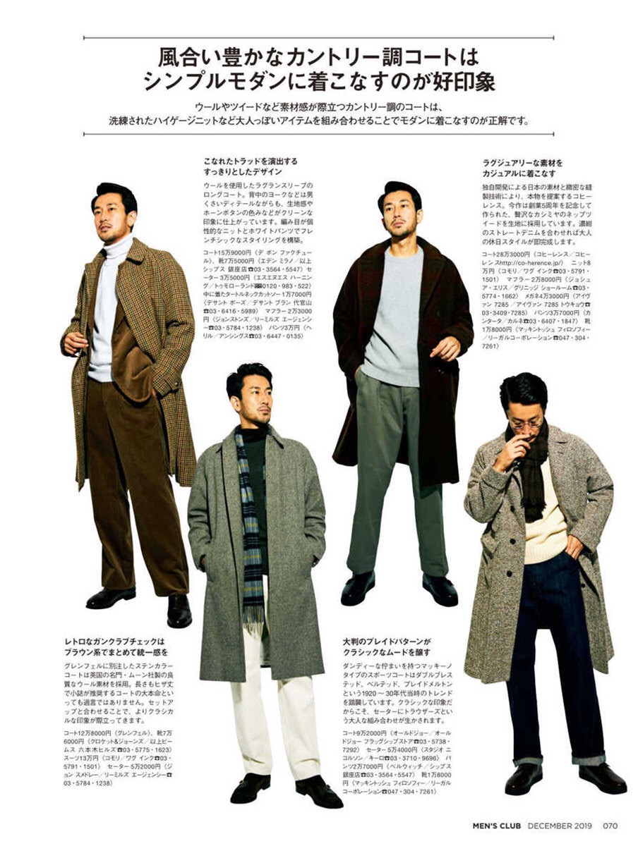 创刊于1954年的MEN’S CLUB,是日本第一本以男性为导向的时尚杂志,至今依然是所谓正统派男性时尚的代表之一。MEN’S CLUB的内容主要提供30岁以上,拥有一定社会地位与消费能力的男性,关于男士西装的流行,穿出低调却又不失都市时尚感的利落,及充满品味的休闲打扮。