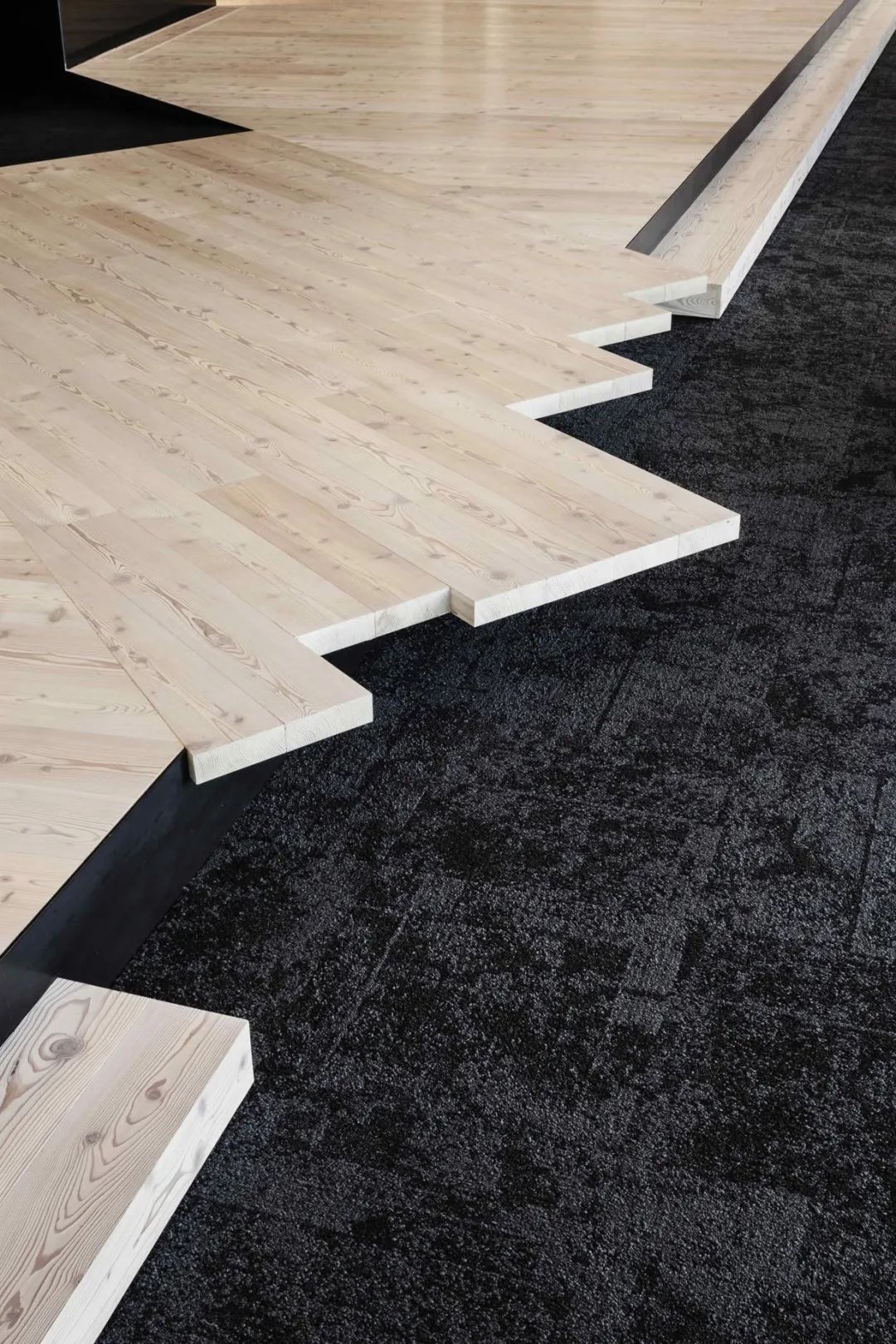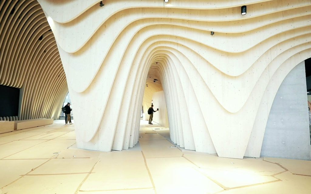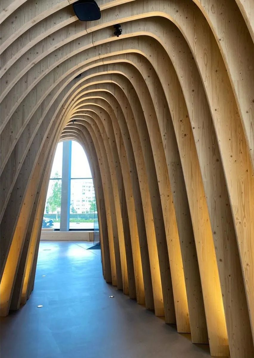一层是一个关于木材知识的展示教育空间,设计师通过木天花板的起伏模拟出自然洞穴的形态。