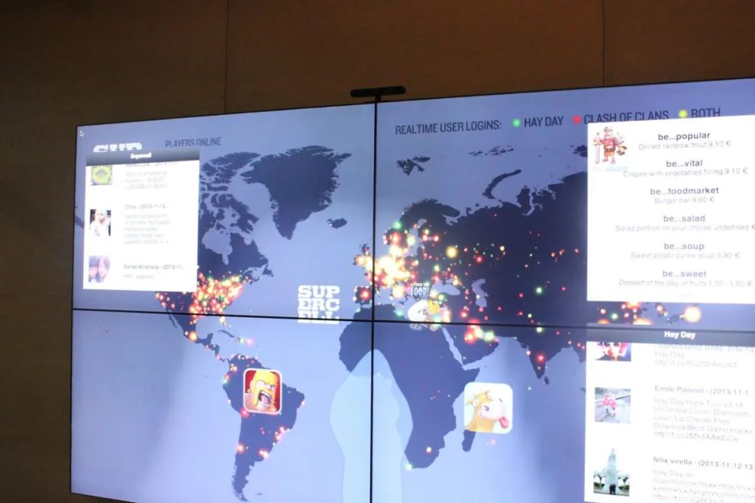 进入办公层,一面巨大的交互屏幕映入眼帘,实时展示着全球用户登陆信息。对于内部人员来说,数据的涨幅是一种鞭策,对于外部人员来说,就当这是Supercell的炫耀吧!