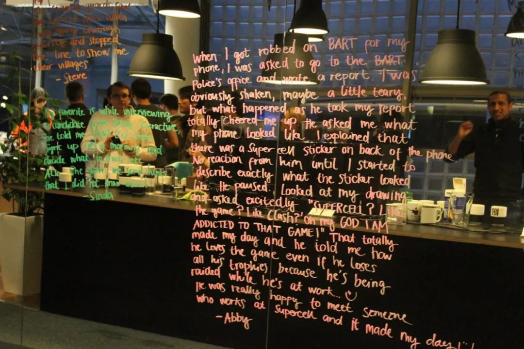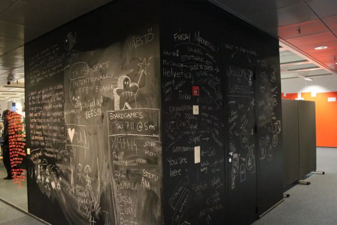 灵感这种东西,迸发的总是非常突然。因此随时记录灵感是每一个设计行业必经的事情。在Supercell的总部,你可以随处可见黑色的粉板,供员工们写写画画交流,连厕所的墙板也是黑板,毕竟「黄金时间」更为珍贵!