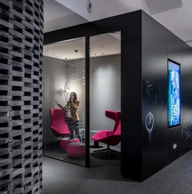 蜿蜒的构造分隔开了办公区域与公共区域,墙面则延续了“黑板”功能。
