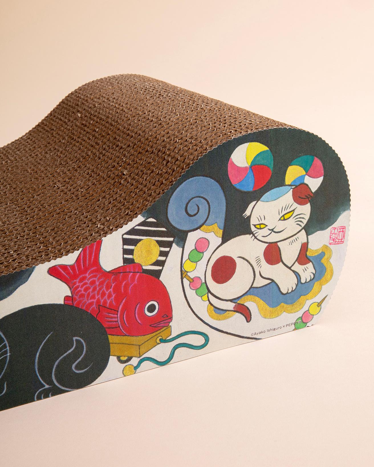 艺术家石黒亜矢子如果大家没听过的话,那么她的老公伊藤潤二那可谓是享誉世界。这款给猫咪的磨抓装置就由石黒亜矢子来亲自绘制,无论从色彩到风格都非常高级,作品上不仅包含了古代的猫妖,同时还有着她个人的想象,让人想要立即拥有。