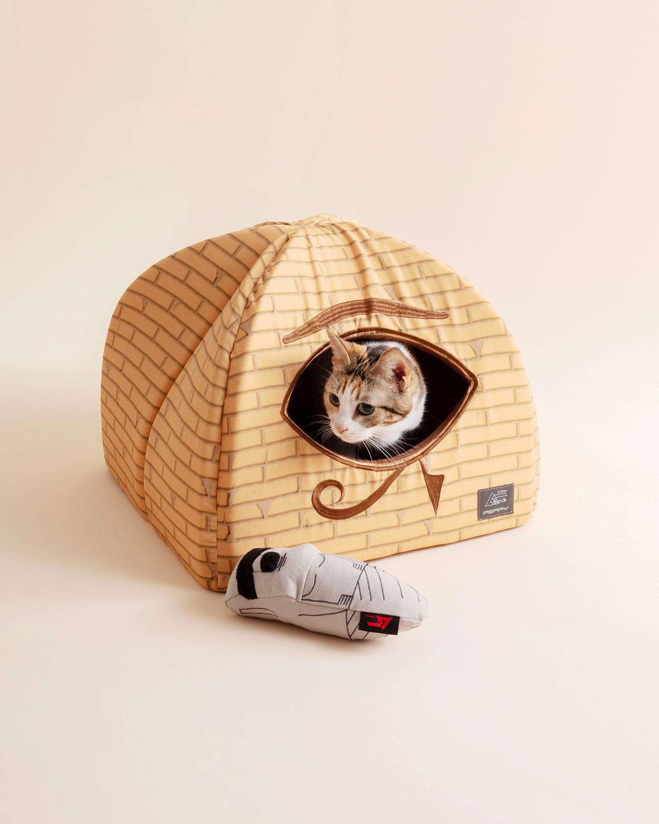 peppy所推出的这款猫屋,将主题直接延伸至了外太空文化,并且取名为《宇宙猫制造BOX》,因为尺寸仅为A4纸大小,还带有提手,所以日常外出携带也都非常方便。另外一款的主题则为金字塔,并在中间还设计了荷鲁斯之眼,具有着非常神圣的含义。好玩的是设计师还配备了专门的细节祭品在猫屋前,日常会发出声音来吸引猫咪进入。