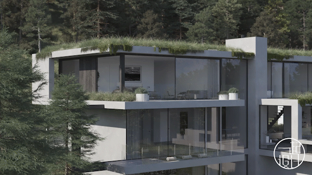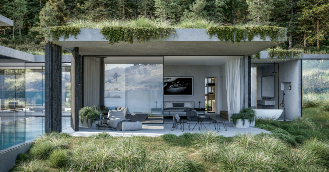 室内包含客餐厅、厨房、休闲区以及 4 间超大卧室套房,朝向湖景一侧的建筑墙体全部由玻璃打造,赋予了建筑轻盈感的同时也将天空和周围的景色映入其中。