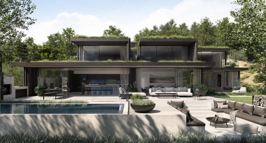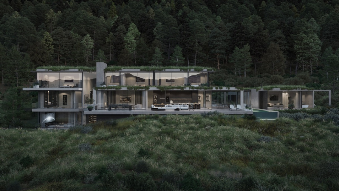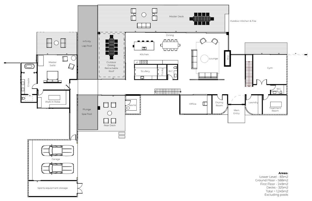 别墅总面积为 1245㎡,室内面积 920㎡,露台 325㎡,共三层,内有 4 间大卧室套房、客厅、餐厅、开放式厨房、还包括 1 个酒窖,红外线桑拿浴房室、无边泳池、大型家庭办公室、健身房、影音室、露台休息区以及 6 个停车场。