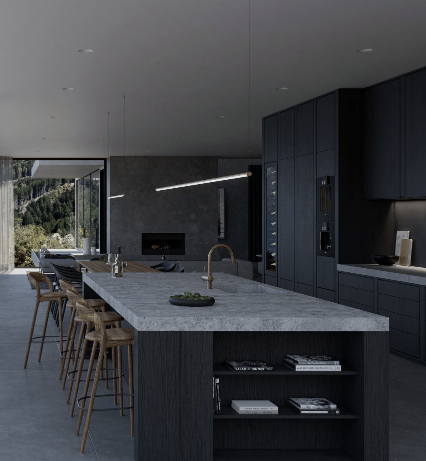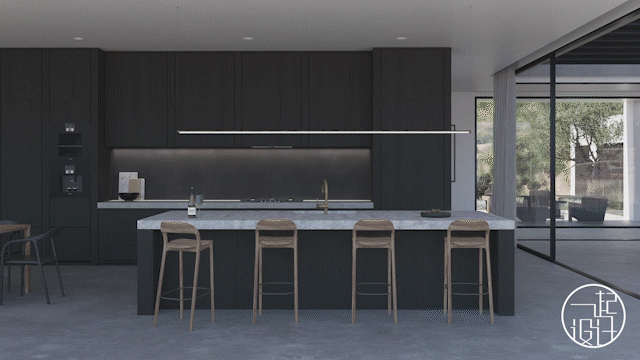 开放式厨房选用黑色橱柜搭配灰色大理石台面,与建筑的低调沉稳相互协调。中岛台的设计不仅能让厨房工作井然有序,宽大的台面更是有效的扩大了料理时的操作空间。
