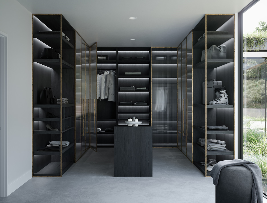 衣帽间选择玻璃做柜体,长虹玻璃做柜门,具有通透感又起到防尘效果,内部不同高低的挂衣区、隔板,满足各种衣物的收纳。