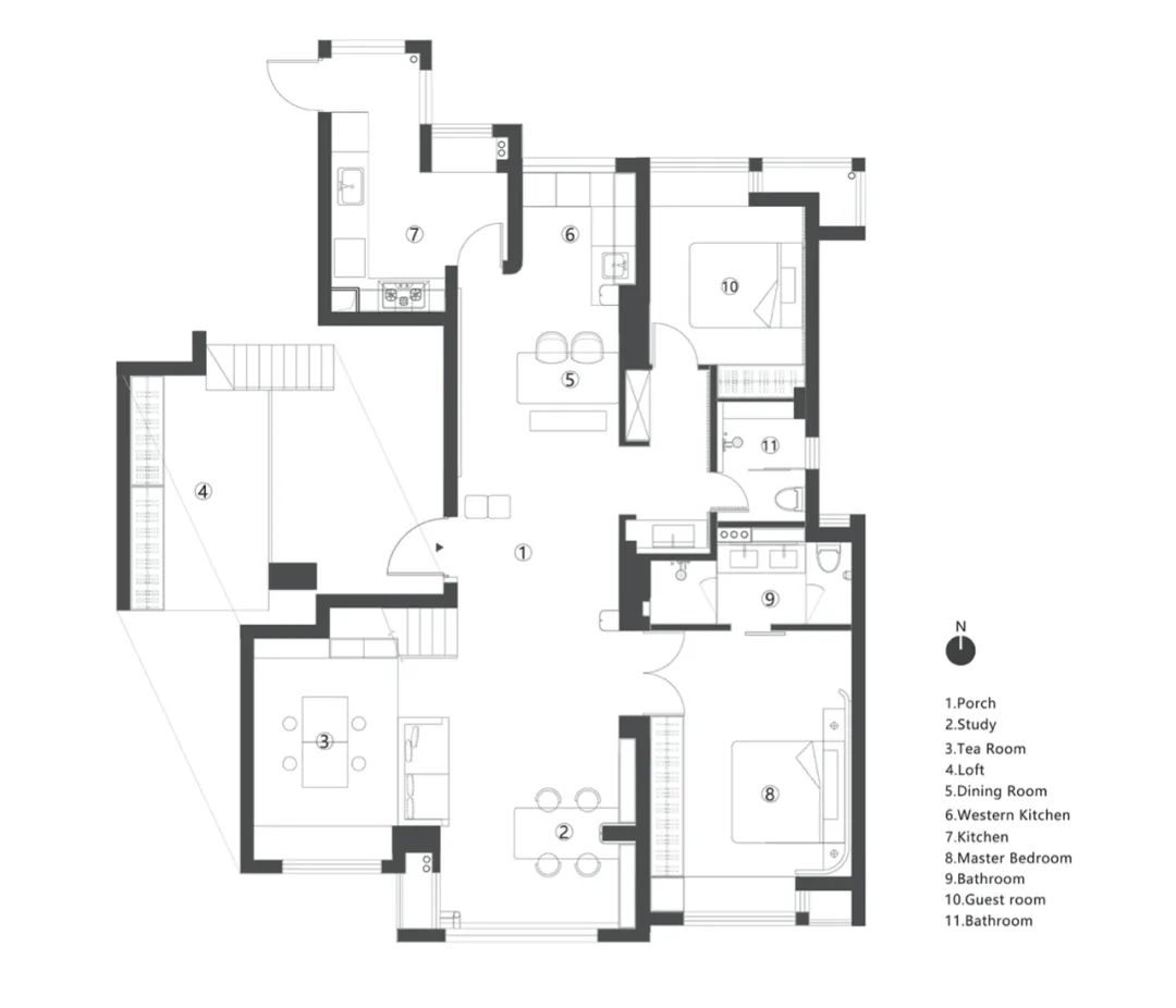 在被打通的动线上,所有对外的功能区都被安排在其中,紧邻书桌北侧的是餐厨区,一张柚木色的长桌承载起用餐功能。