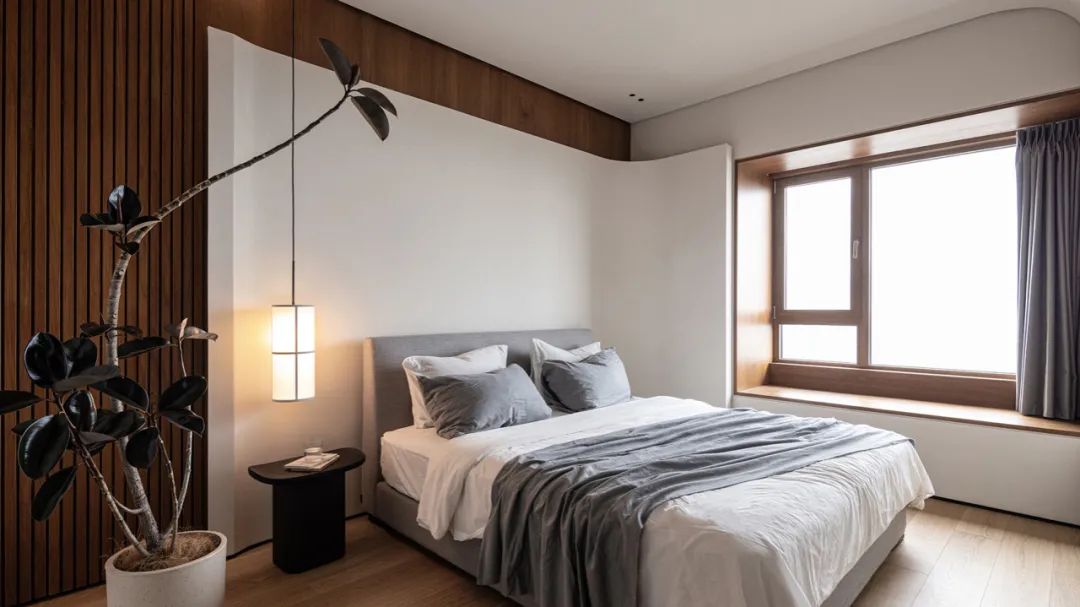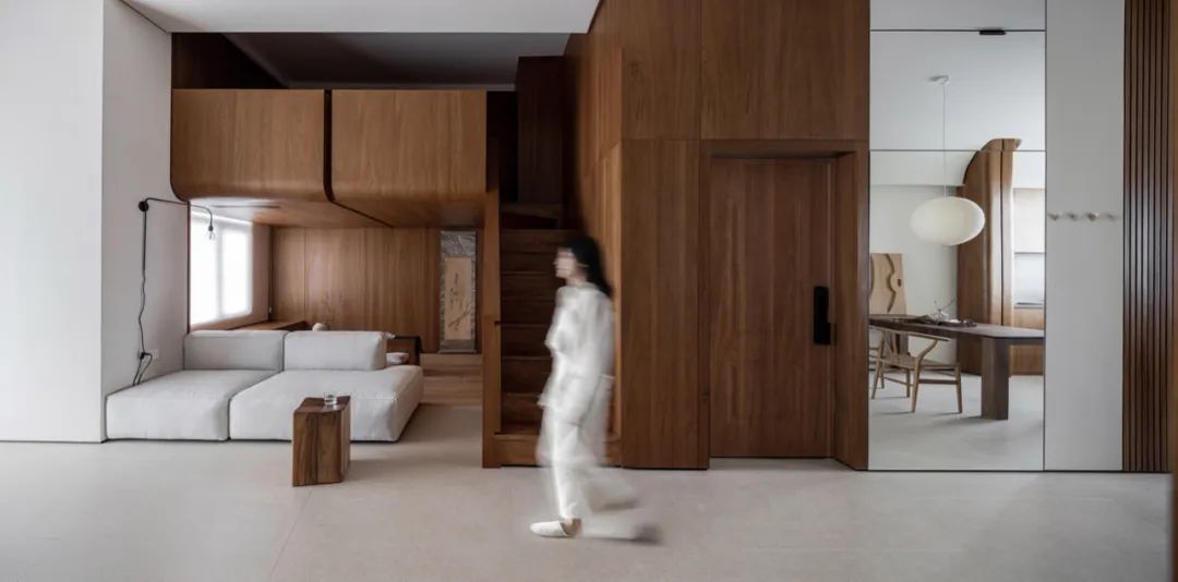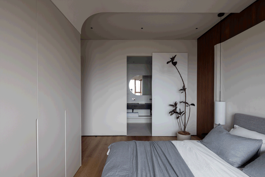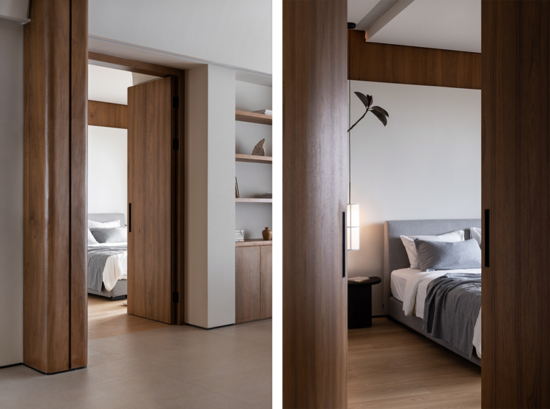 南侧的主卧是整体设计的最大亮点,因与公共空间平行相对,设计师采用东方文化中的双开木门,以“推木步入”的仪式感,为进入起居室营造出一番情趣。