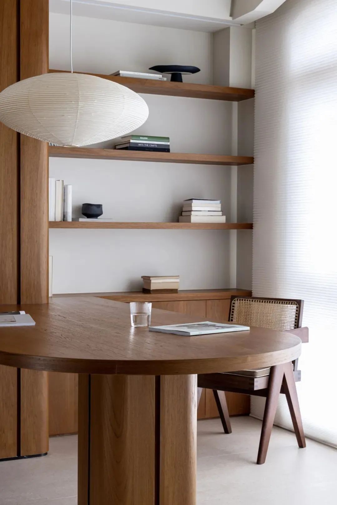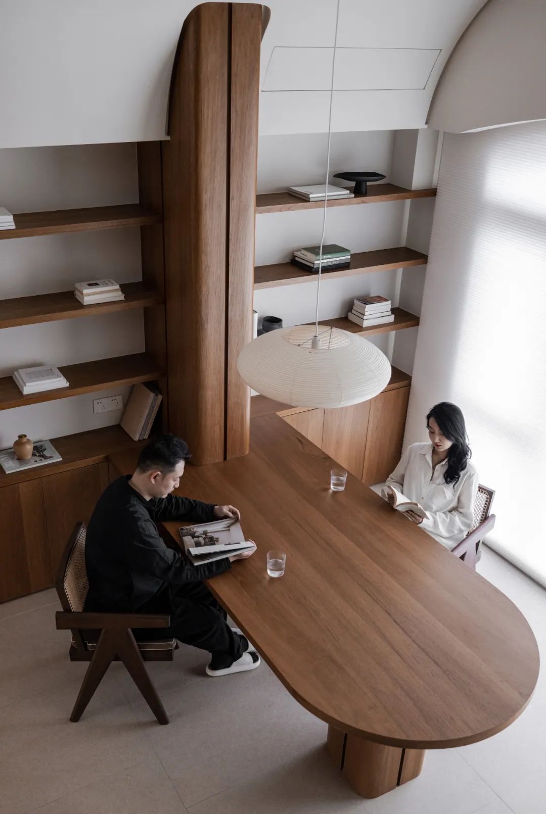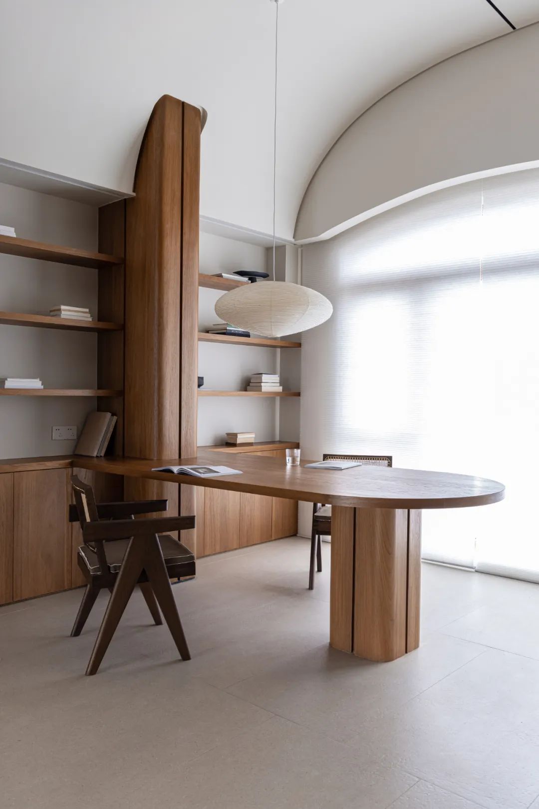 靠近落地窗的位置,打造成了一个集阅读与工作为一体的功能区。一张大的阅读桌沿着立柱铺陈开来,折纸灯垂下,笼括一方天地。每一根柚木上增加的弧形元素和凹槽细节,显得灵动又生趣,而且它们贯穿了整个大型公共空间,并延伸至大阅读桌和桌腿上,使得整体浑然天成。简易的书架充满新意,幽静的氛围让人抛开杂念,瞬间沉浸在知识的海洋里。