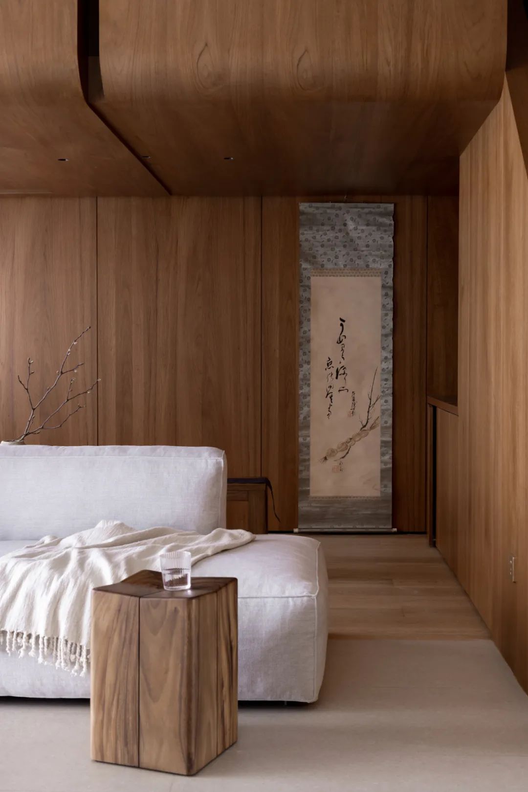 3.利用温润的柚木与粗粝的磨石,衬托空间的纪念感与时光的静谧感。