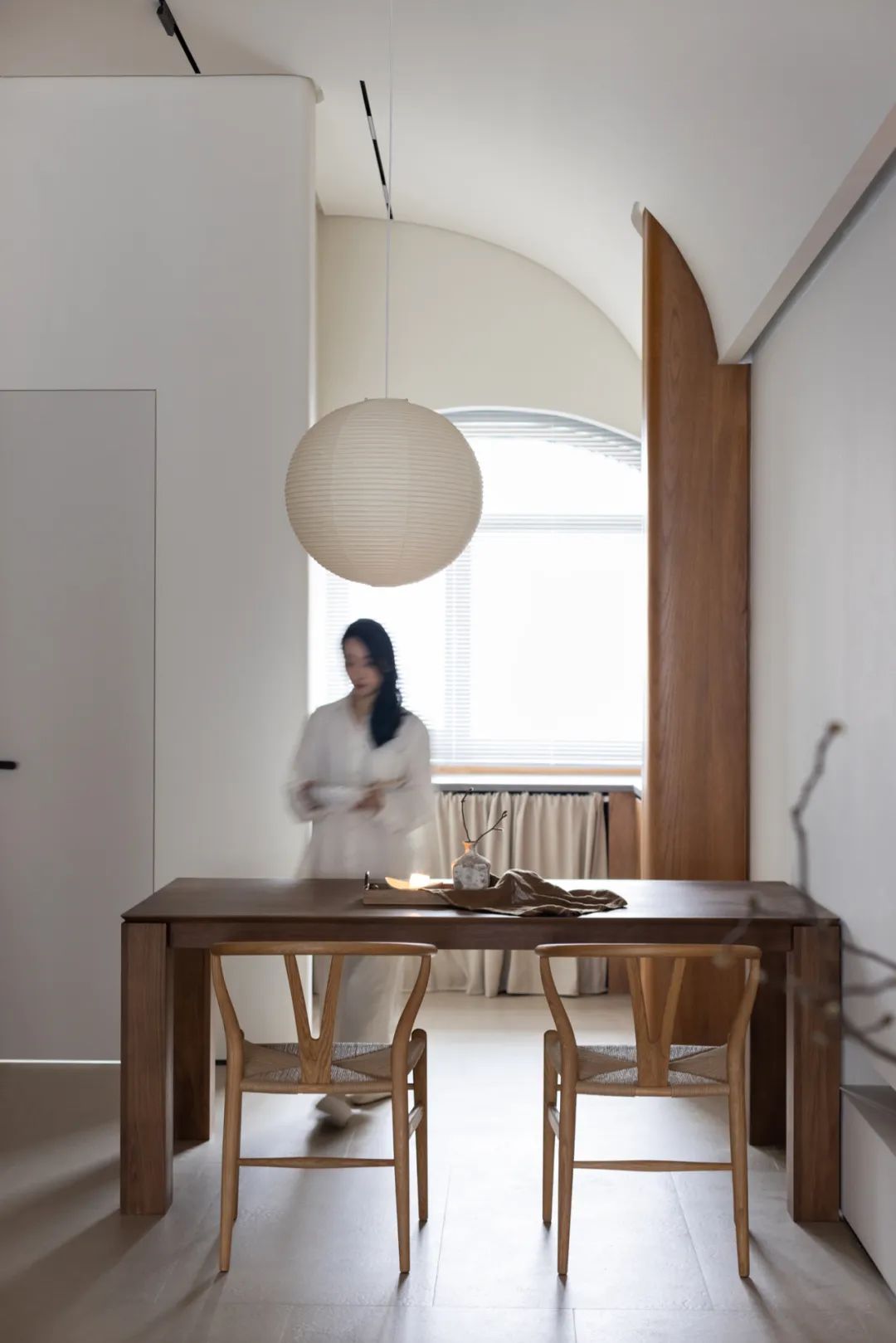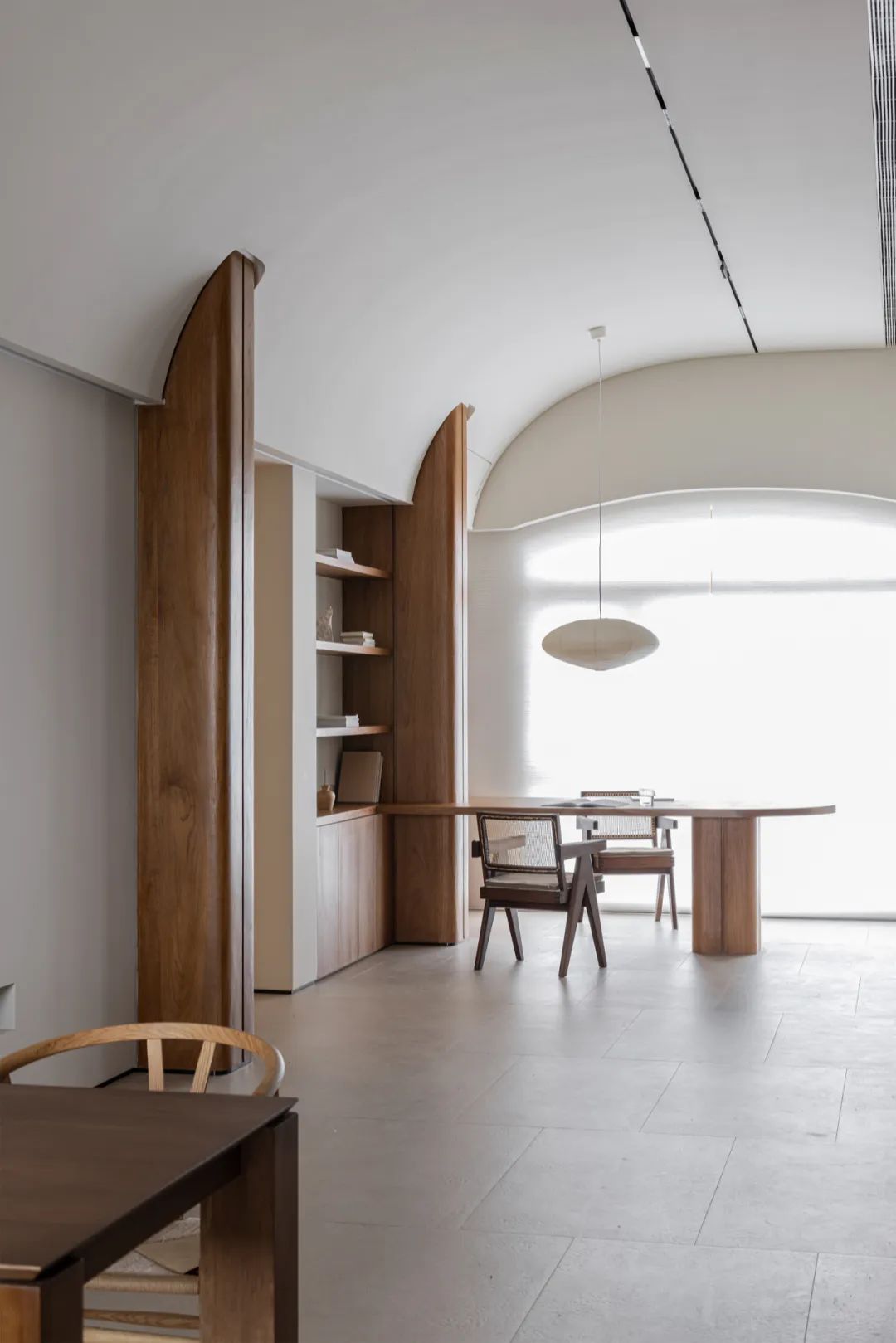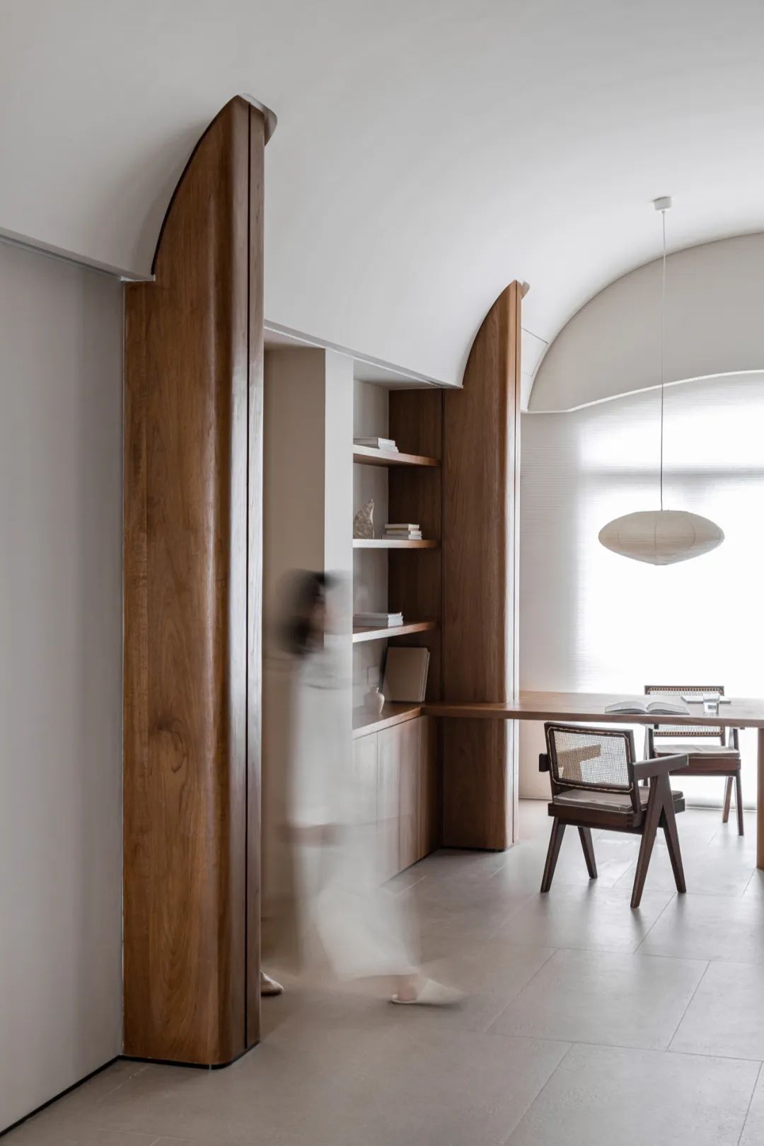 设计师经过与屋主夫妇的深入交流,尤其是对他们过往经历与生活态度的深入了解后,重新梳理了住宅内线面体和空间营造本身的关系,规避原始限制条件,以“微拱形的窗洞结构”开启了这个私宅项目的造型线索。