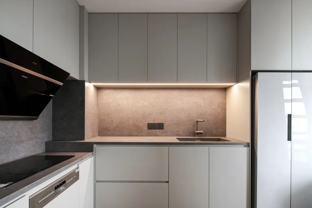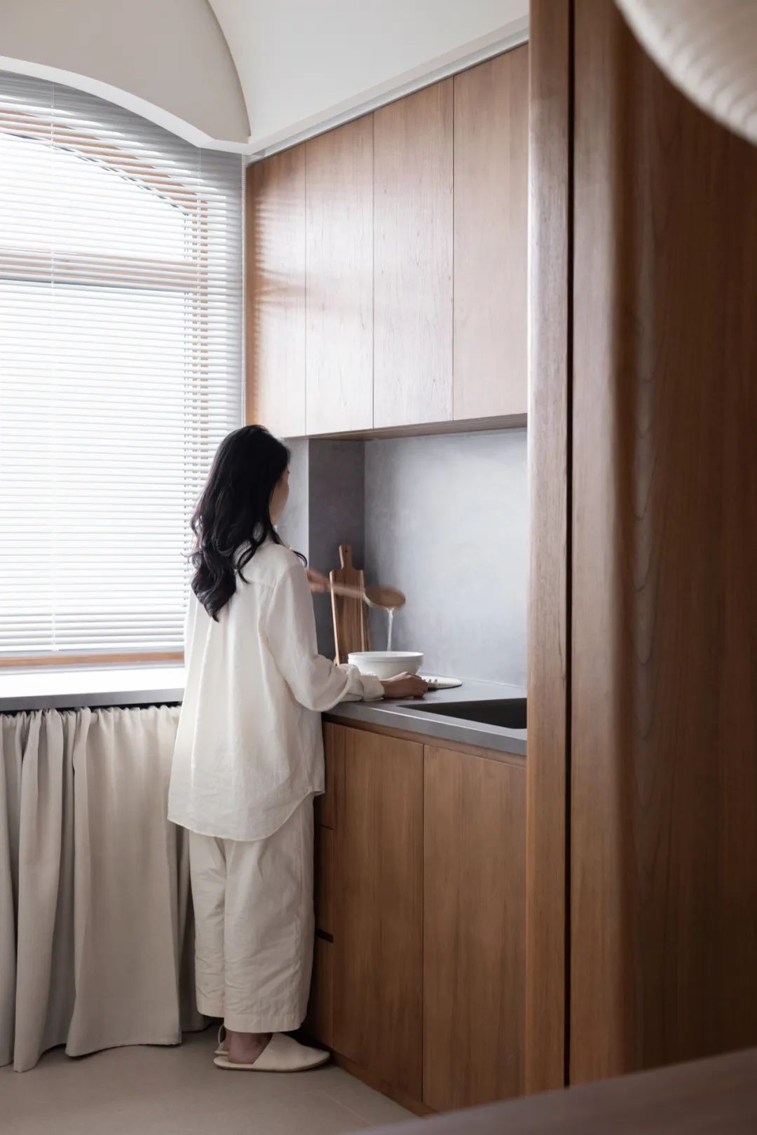 简洁干净的中厨,没有夸张的色彩和过多的装饰,但有着分寸必争的收纳空间。橱柜选用厨房中的常用色白色,与一旁西厨的木色搭配清新自然,营造出惬意温馨的厨房空间。