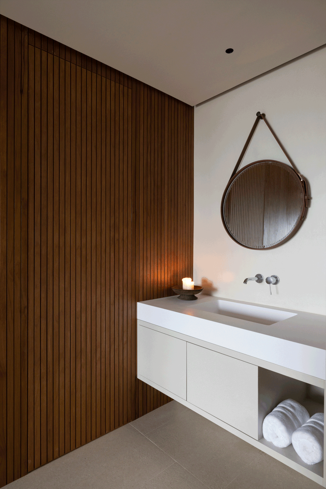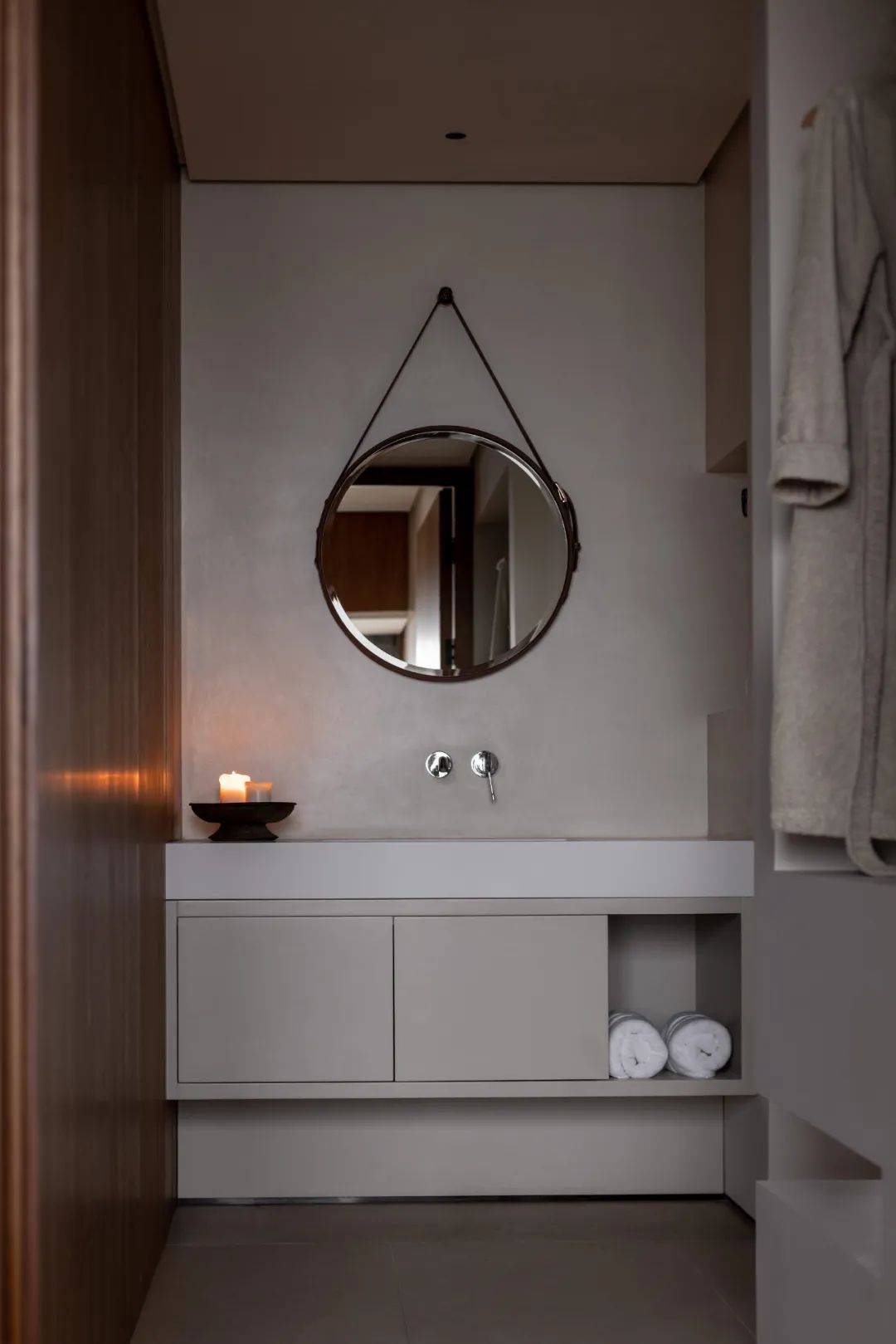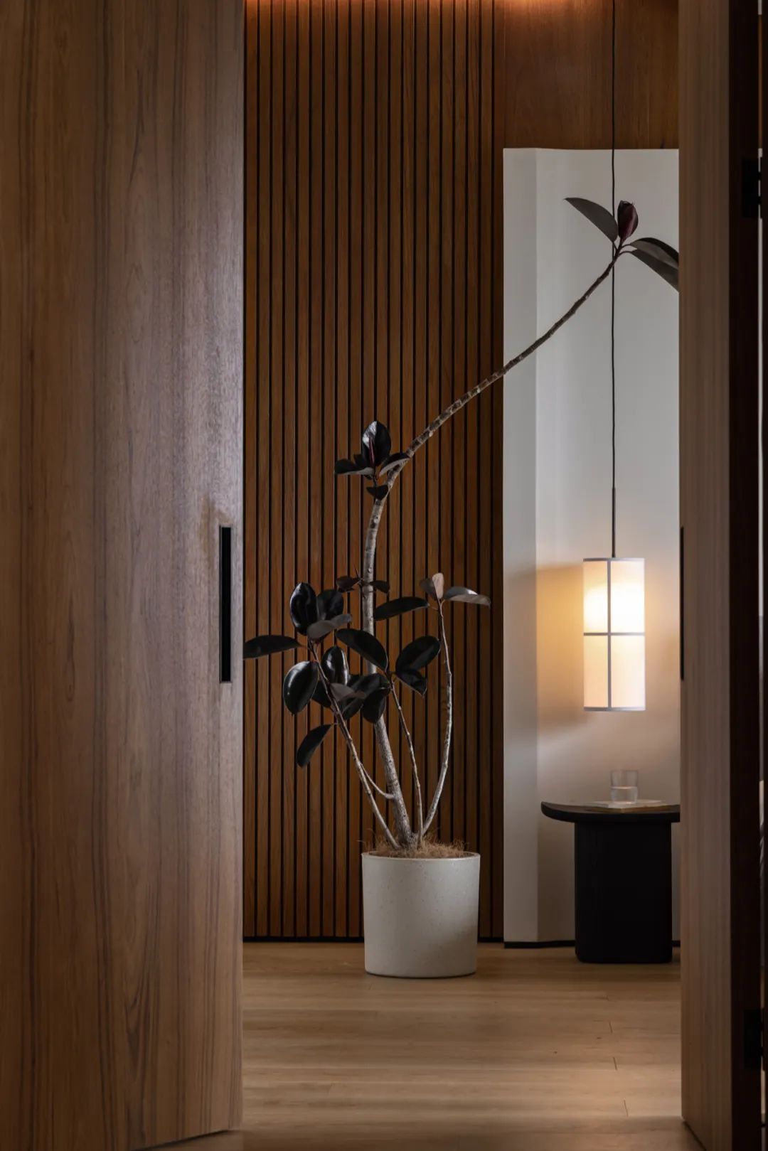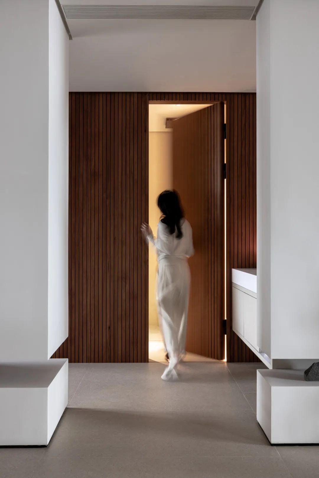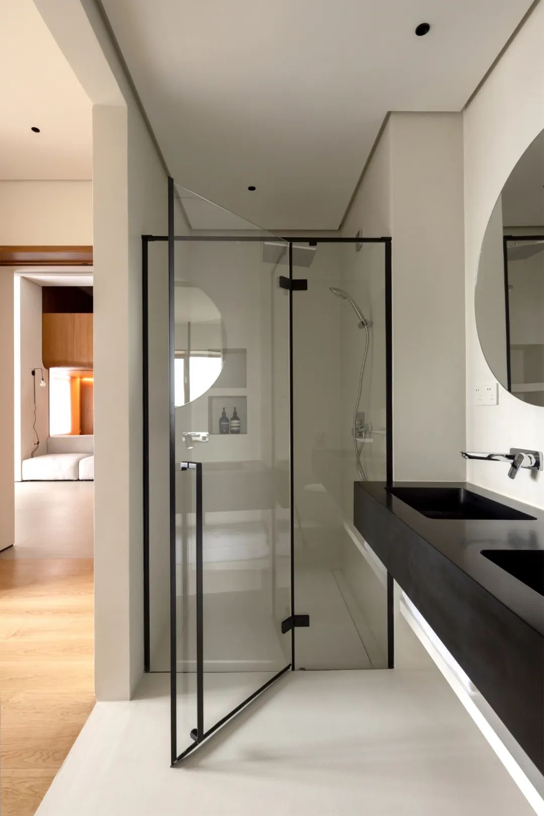 隐形门被木格栅覆盖,消解客卫的存在感。采用两分离设计,将洗手台安置在了走廊尽头,大大提高了使用效率。