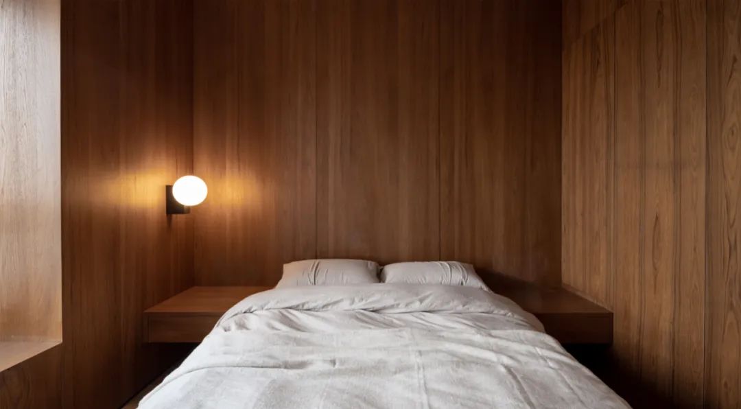 被全柚木包裹的次卧以木盒子的形态出现在屋子一隅,如森林般的深色木饰面简洁大方,唤醒人们心中回归自然的渴望,一盏温暖灯光恰到好处的装饰了墙面,让人不禁沉浸于美好的时光。