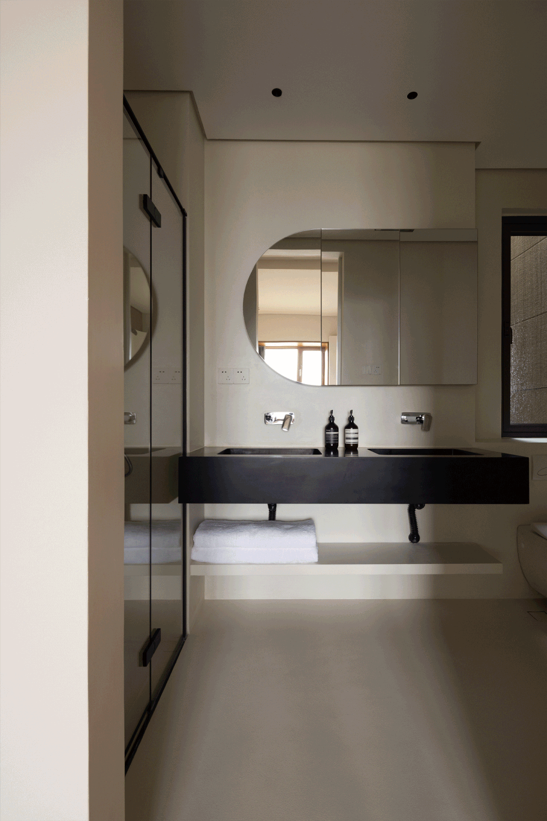 主卫被隐藏在一扇与墙体同色的推拉门后,黑色石台双面盆,让两人洗漱互不打扰。呼应卧室墙面做弧形处理的镜面足够宽大,天气晴好时,倒映出飘窗的反光,更加强了空间的灵动氛围。不影响进光的玻璃门和浅色地砖都体现了卫浴间该有的清爽和干净,在这个面积并不大的空间里,各种功能设备一应俱全。