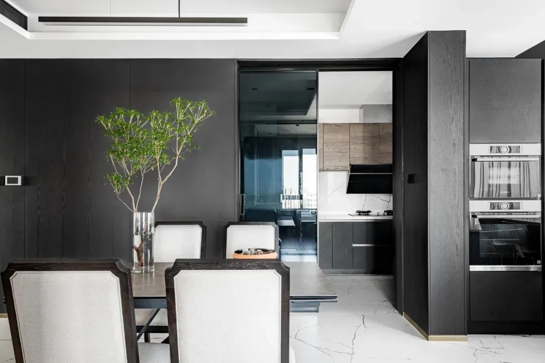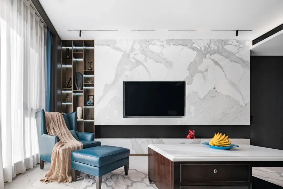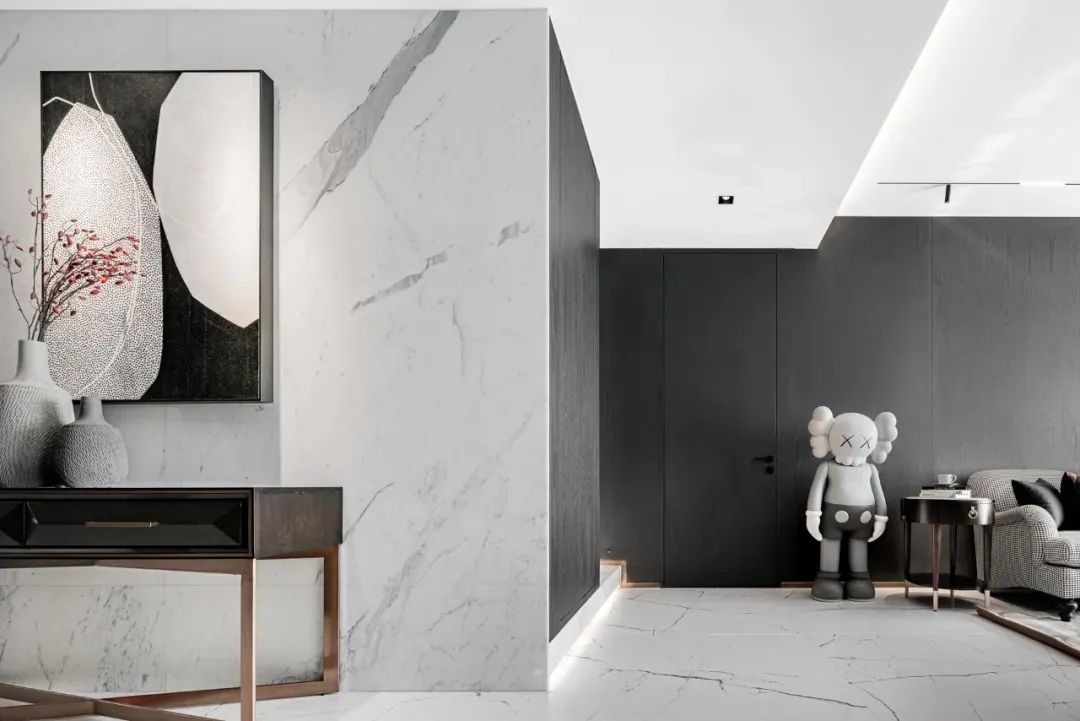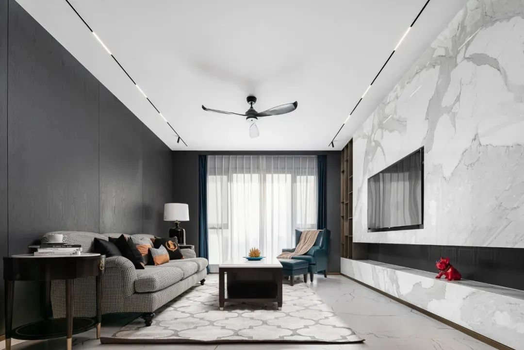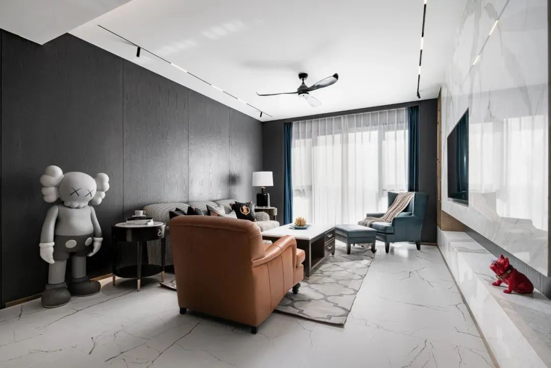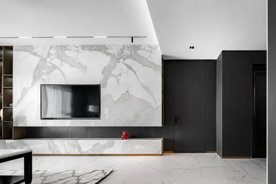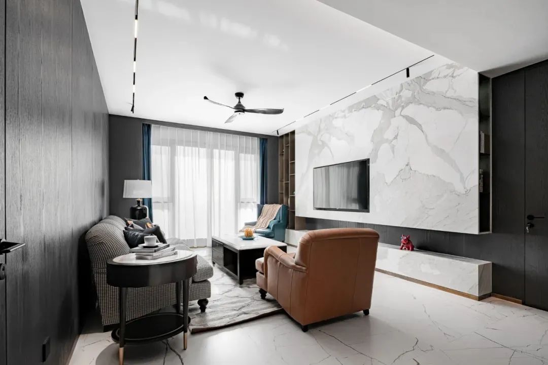 步入客厅,地面白色纹理瓷砖与黑胡桃木背景墙相互映衬,黑与白、柔与刚之间赋予空间灵动的生命力。