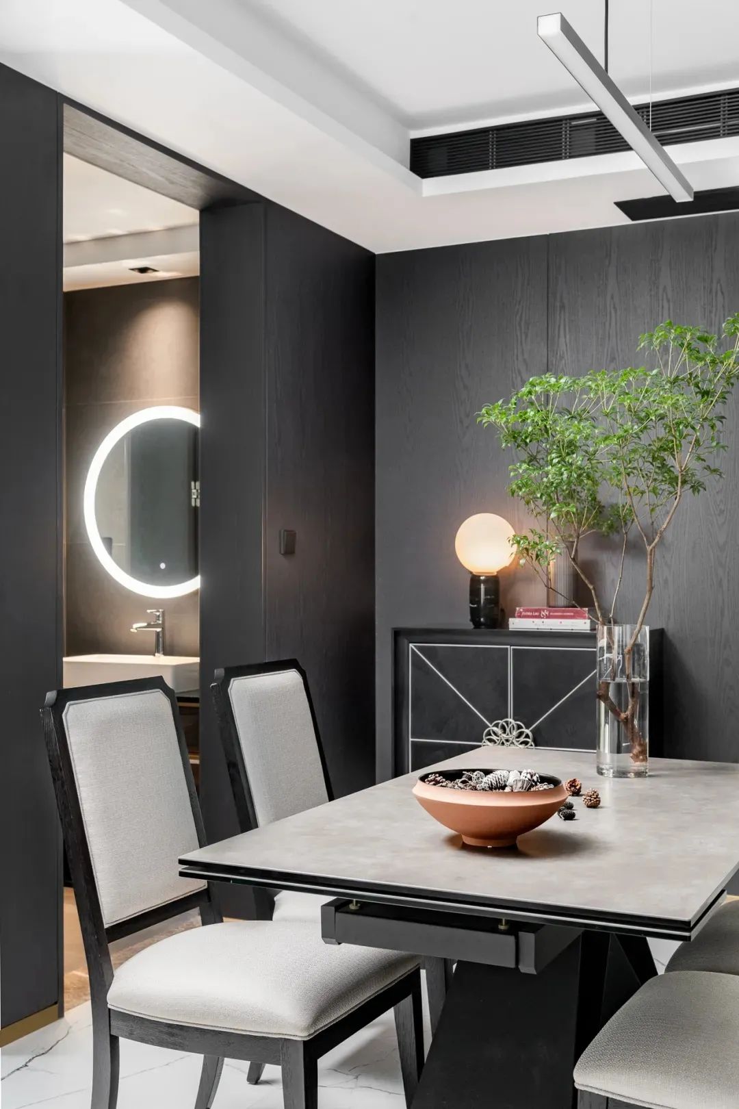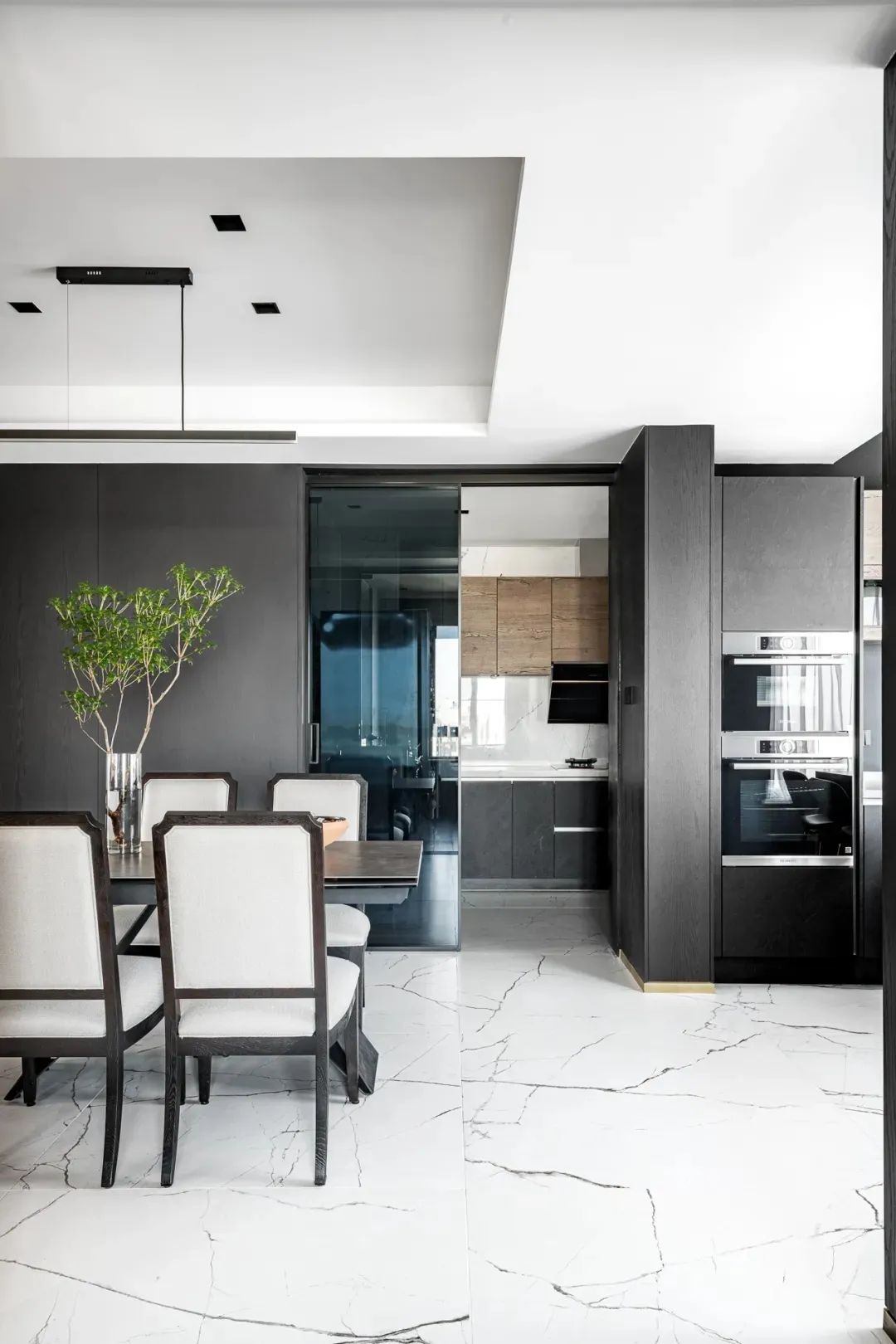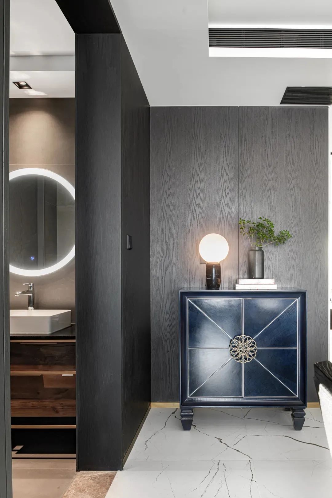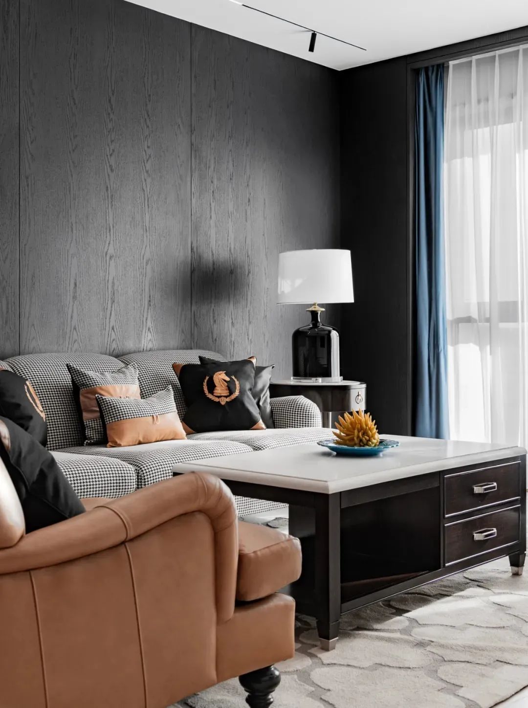 步入客厅,地面白色纹理瓷砖与黑胡桃木背景墙相互映衬,黑与白、柔与刚之间赋予空间灵动的生命力。