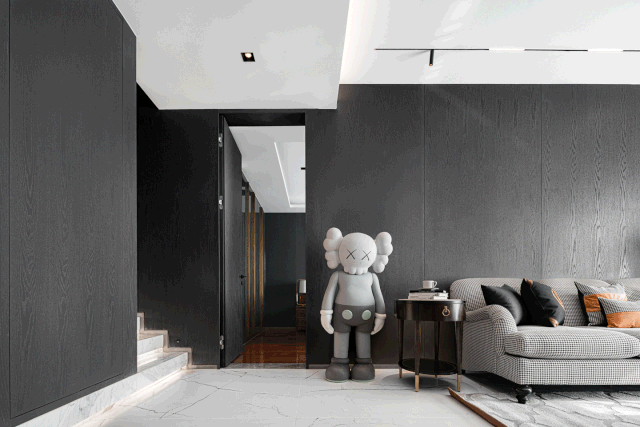 潮牌KAWS公仔位于空间枢纽处,可爱、时尚。旁边是卧室隐藏门,左侧可通往二楼。