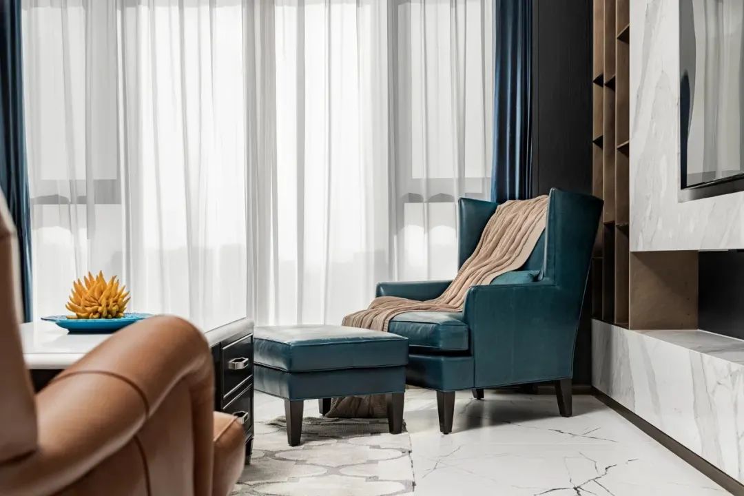 软装配饰中,设计师优选爱马仕橘与湖水蓝皮质沙发、美式方格沙发置于空间,围合式设计打造出清雅自然、舒适惬意的交流氛围。