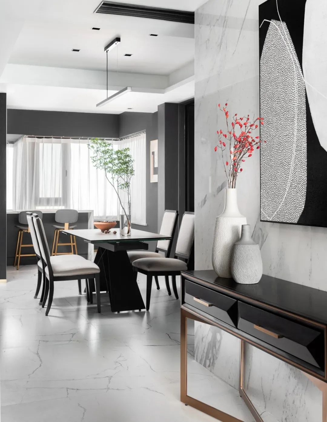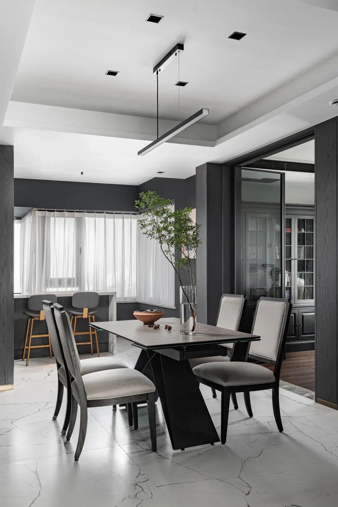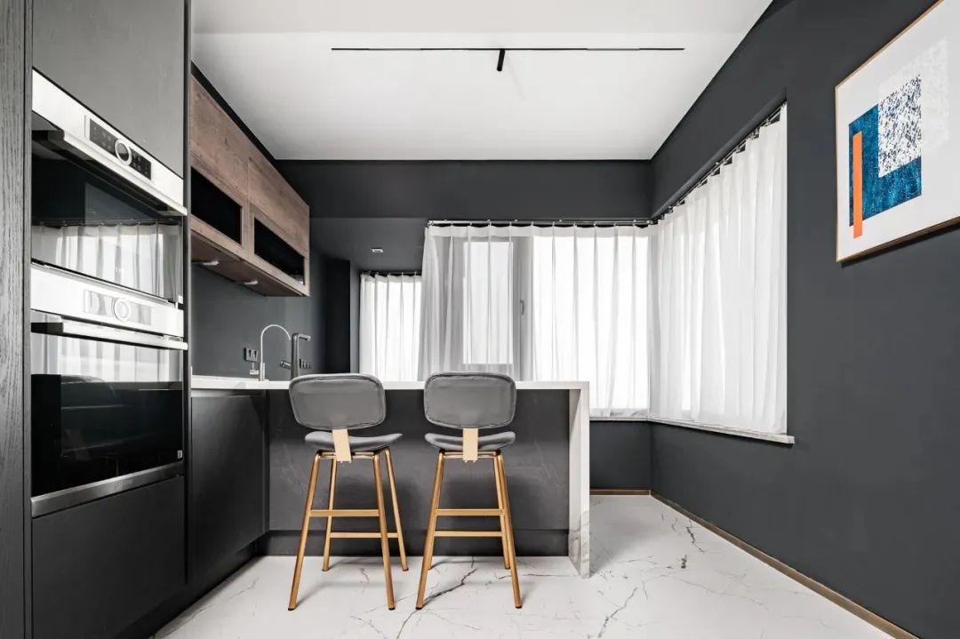 餐厅外侧靠窗是吧台区域,吧台丰富了空间层次与节奏,闲暇时光,业主和家人可坐在这里品品酒,享受轻悠时光。