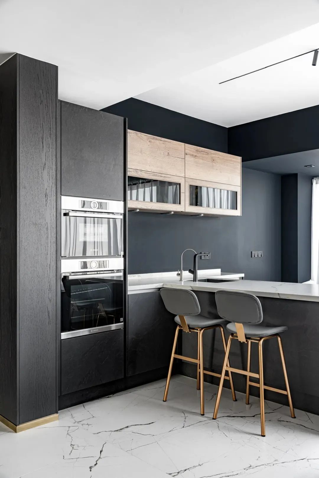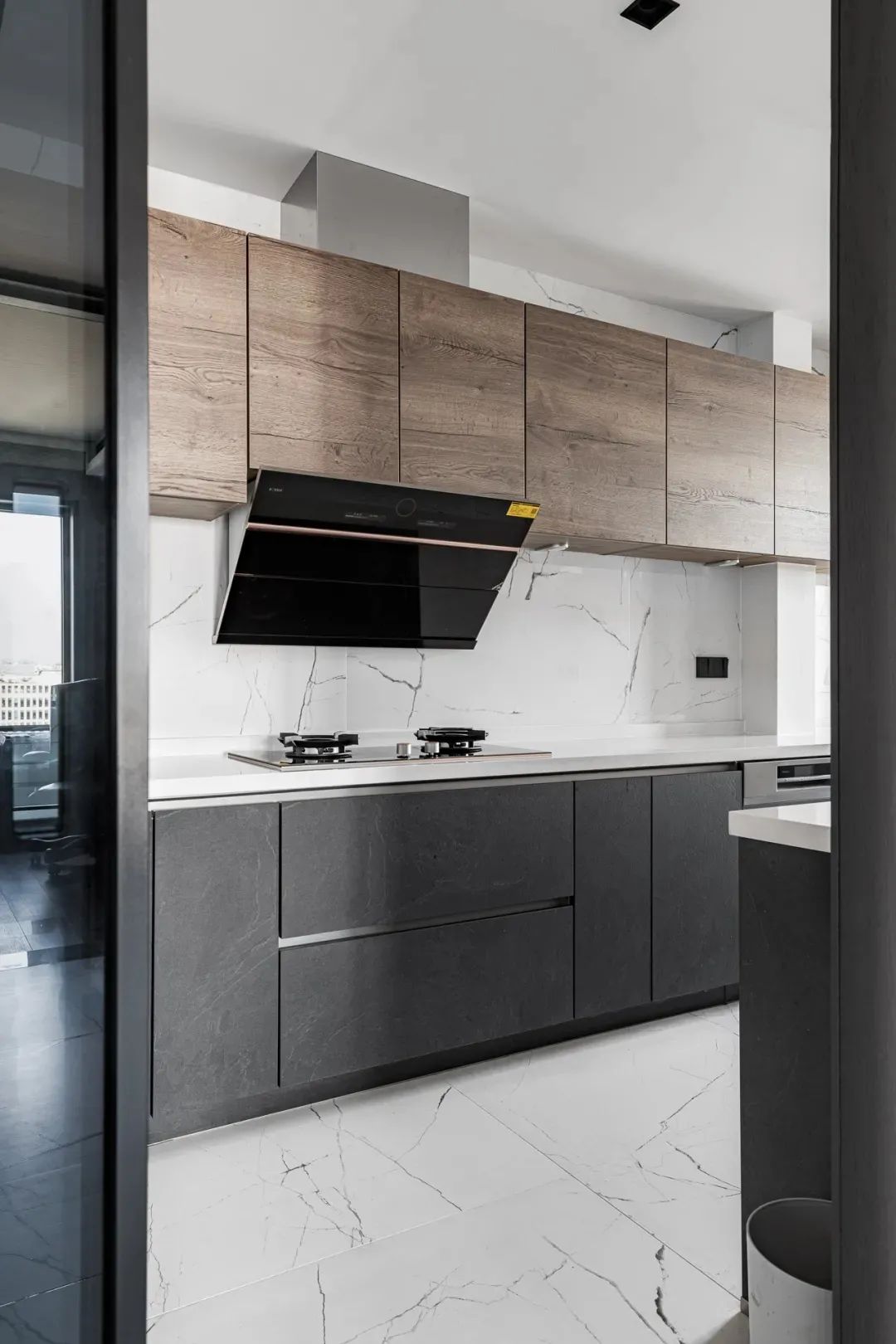 橱柜,胡桃木吊柜搭配深灰色底柜、白色纹理瓷砖背景墙,木的纹理与瓷砖基底,冷暖交织、互补和谐。