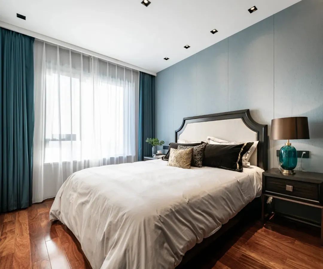 主卧设计师桑春洋以湖蓝色为空间主调,干净利落的基底,没有一丝多余,看似不经意的搭配之下,一切浑然天成。