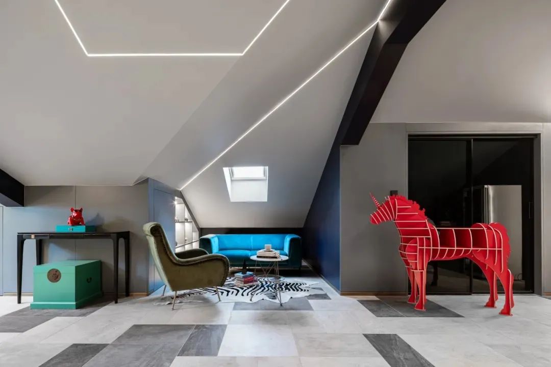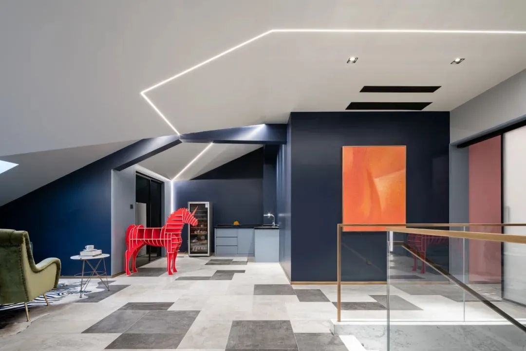 休闲区,设计师选取深蓝色为空间背景,同时,加以橘色和红色软装点缀,以克制和平衡的手法, 表现丰富而纯粹的设计本质。