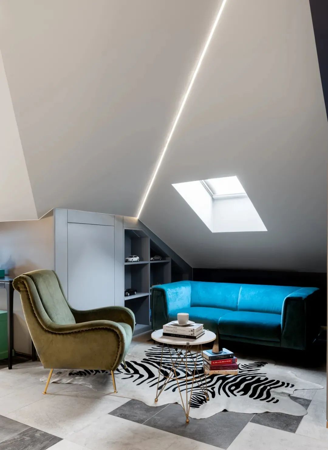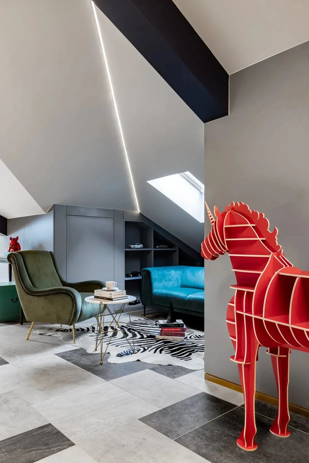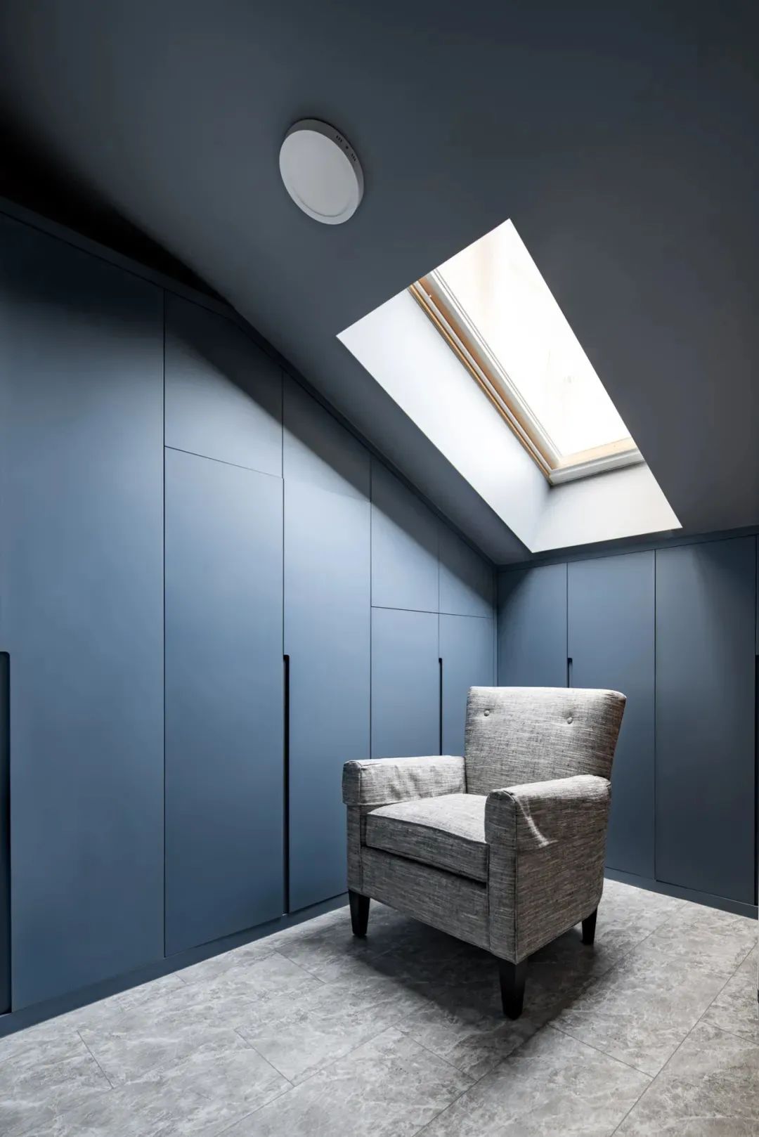 阁楼一角因势化身为了儿童房衣帽间,实现对限制区域的最大利用同时,也实现了功用与美学的完美融合。