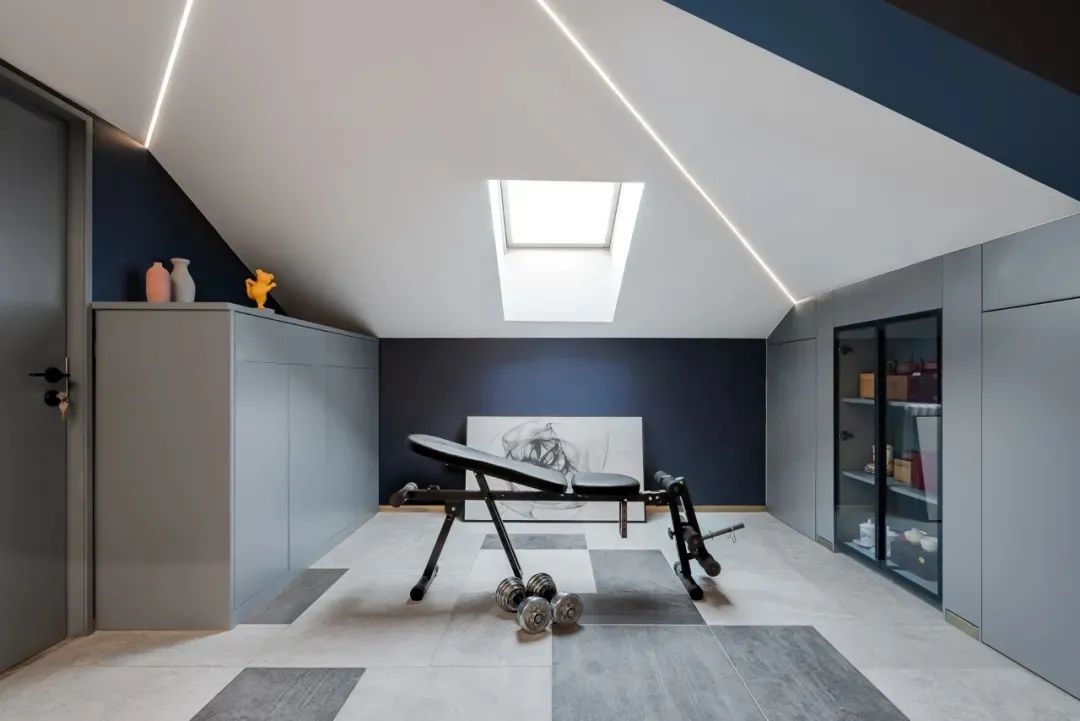 健身区,顶面对外天窗将自然光线巧妙引入室内,搭配不规则几何灯带,以柔和的方式留住适宜照度。