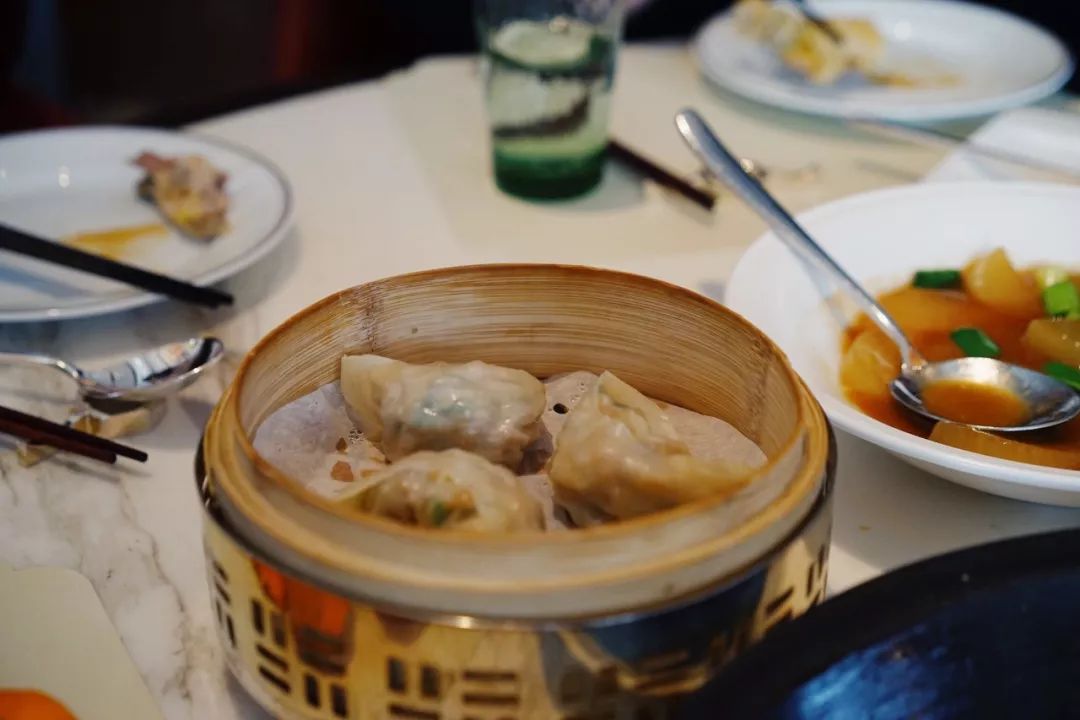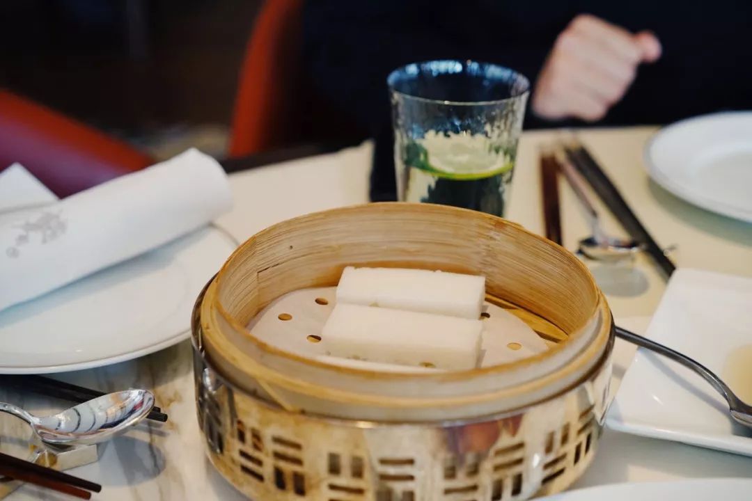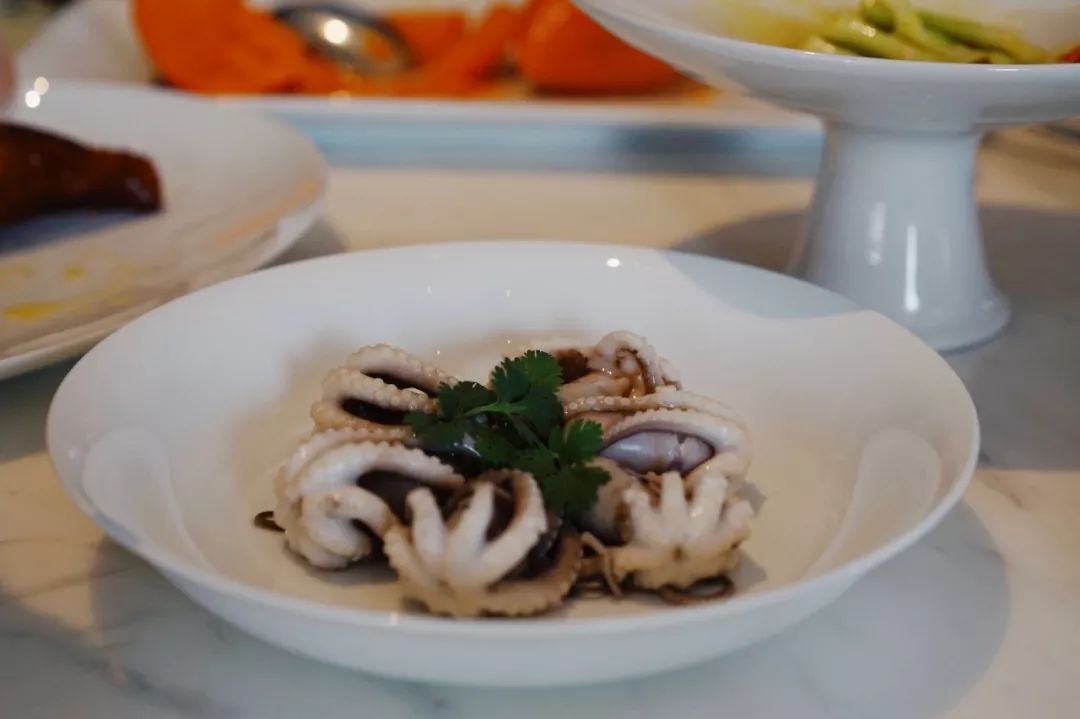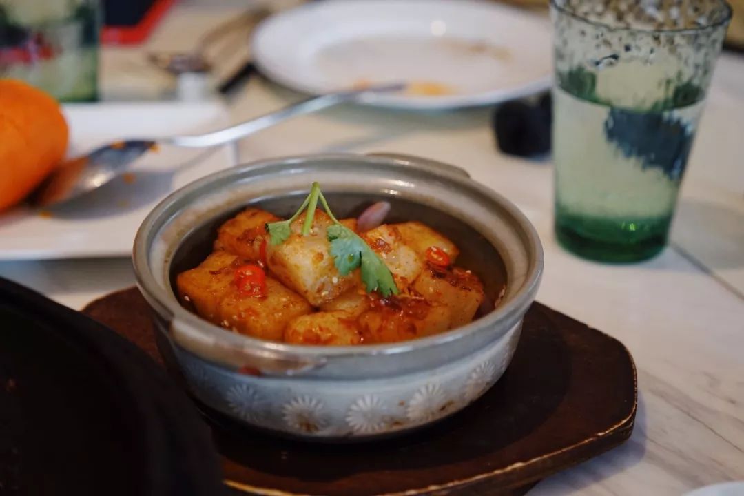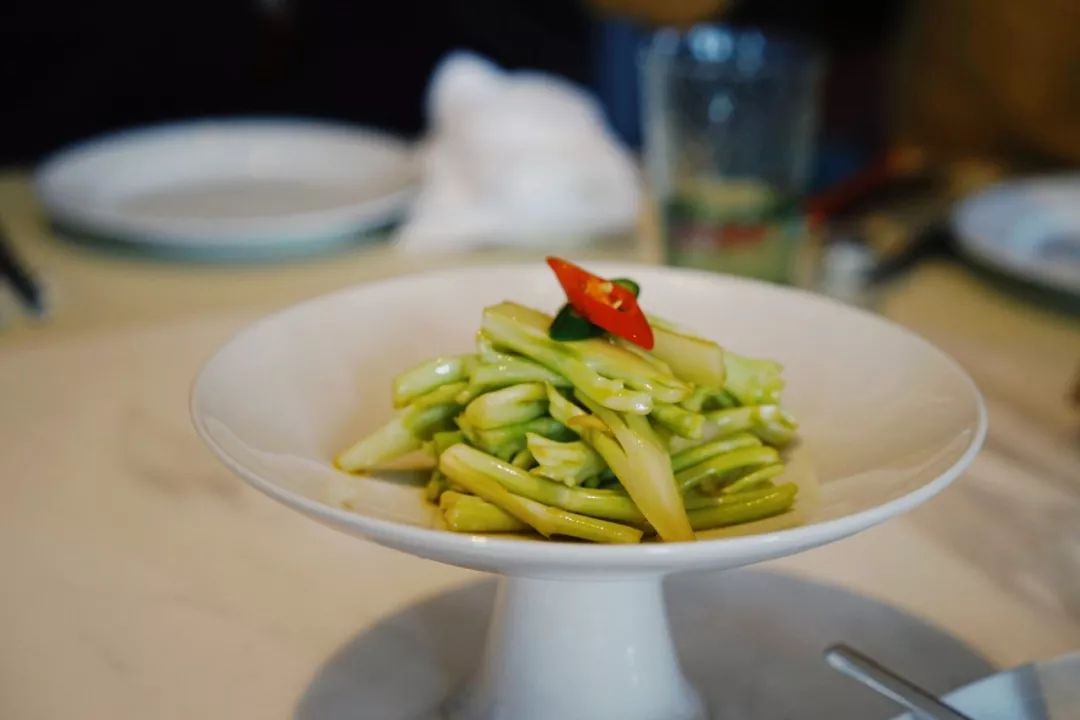 搭这一桌稍显腻的江浙菜,还真的挺配。接着说说菜品吧。前菜是酸辣菜花梗,挺开胃的小凉菜。点心里的XO萝卜糕和怀旧白糖糕也都不错。