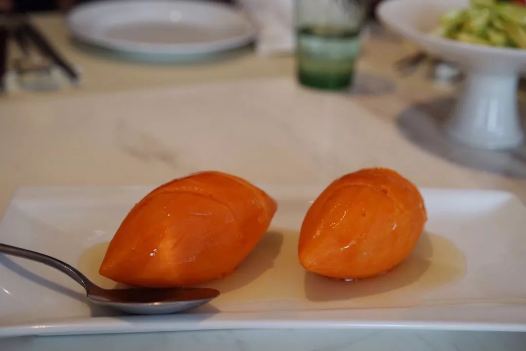 蜜汁红薯获得了甜食党的一致好评,厨师用大红薯手工削成了规整的模样,湿湿润润,不过对我来说,甜味太足,有些过于像道甜品。我可能还是更中意皮焦流油、软软糯糯、热气腾腾的街边烤红薯。