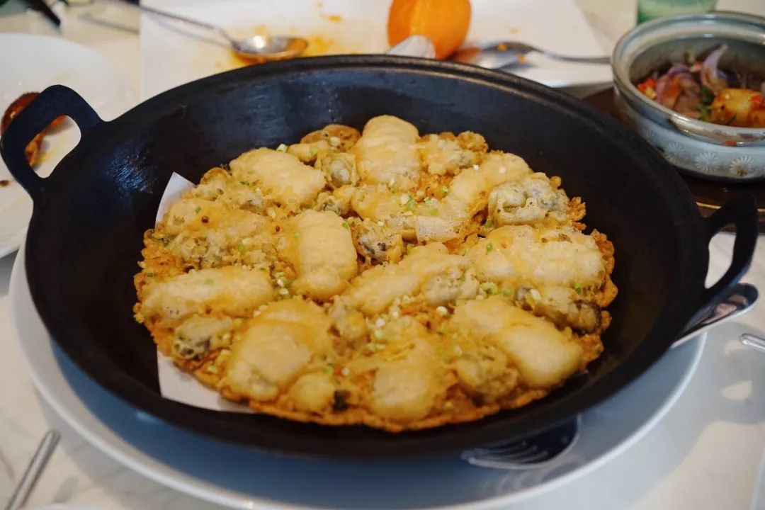 水潺蚝烙黄澄澄一大盘上桌,水潺(龙头鱼)的肉很肥厚,很香软,蚝嘛就很迷你了。不过这道就不容易多吃了,脆外衣里的油锁得死死的,一口一油飙的感觉。还好点了雷司令。
