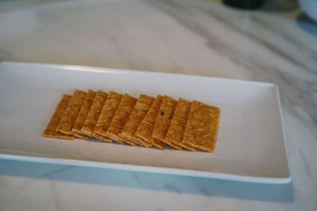 鸡头米的杏仁汁是真的苦啊,安陵容临死前吃的苦杏仁大概也不过如此苦了吧?其实用白水煮就很好了,台州本店似乎也没有用到杏仁汁。不过杏仁饼倒是甘香沁甜,香香脆脆,越嚼越香,也非常适合下酒。要是早点上,我都想追加一杯威士忌了。