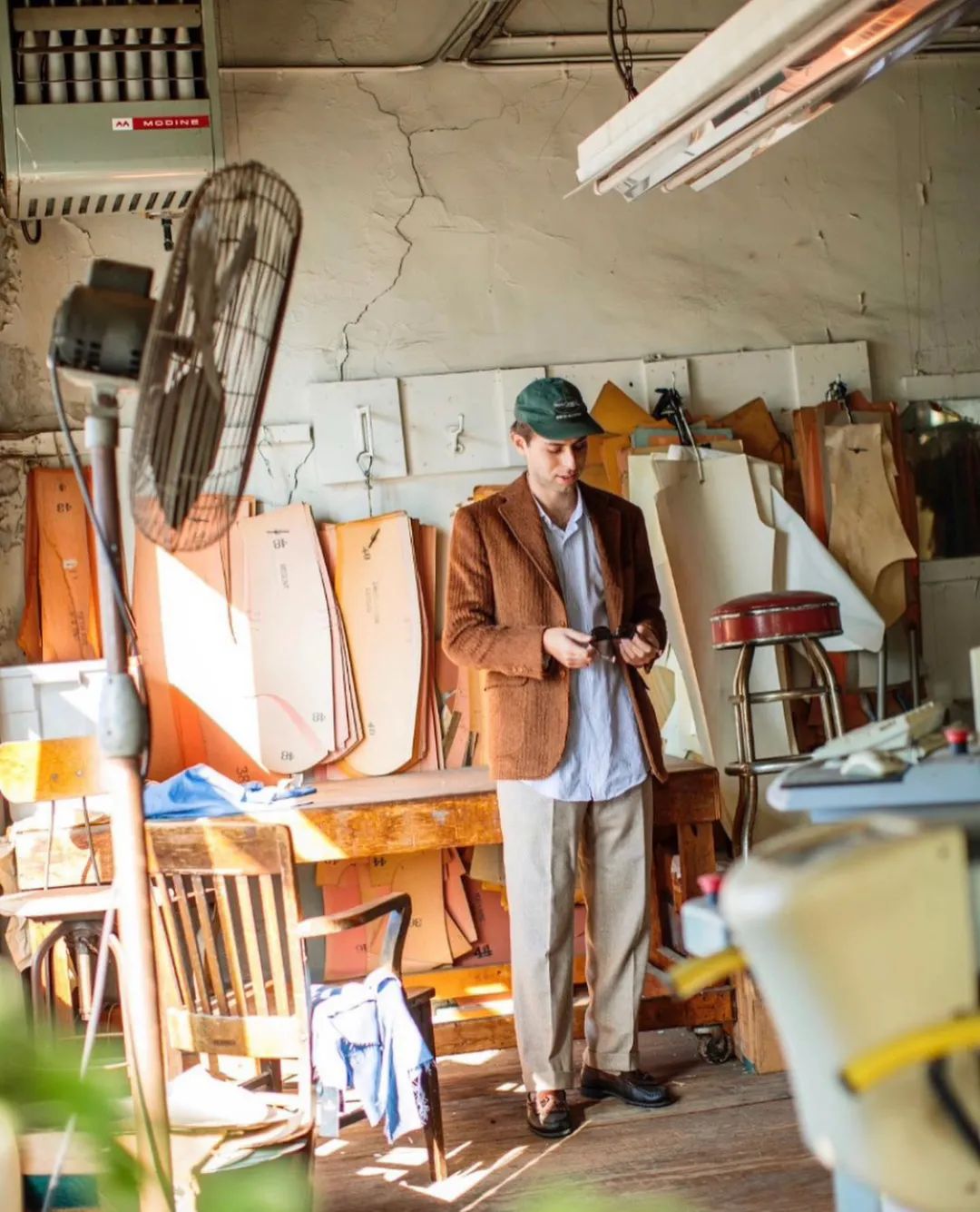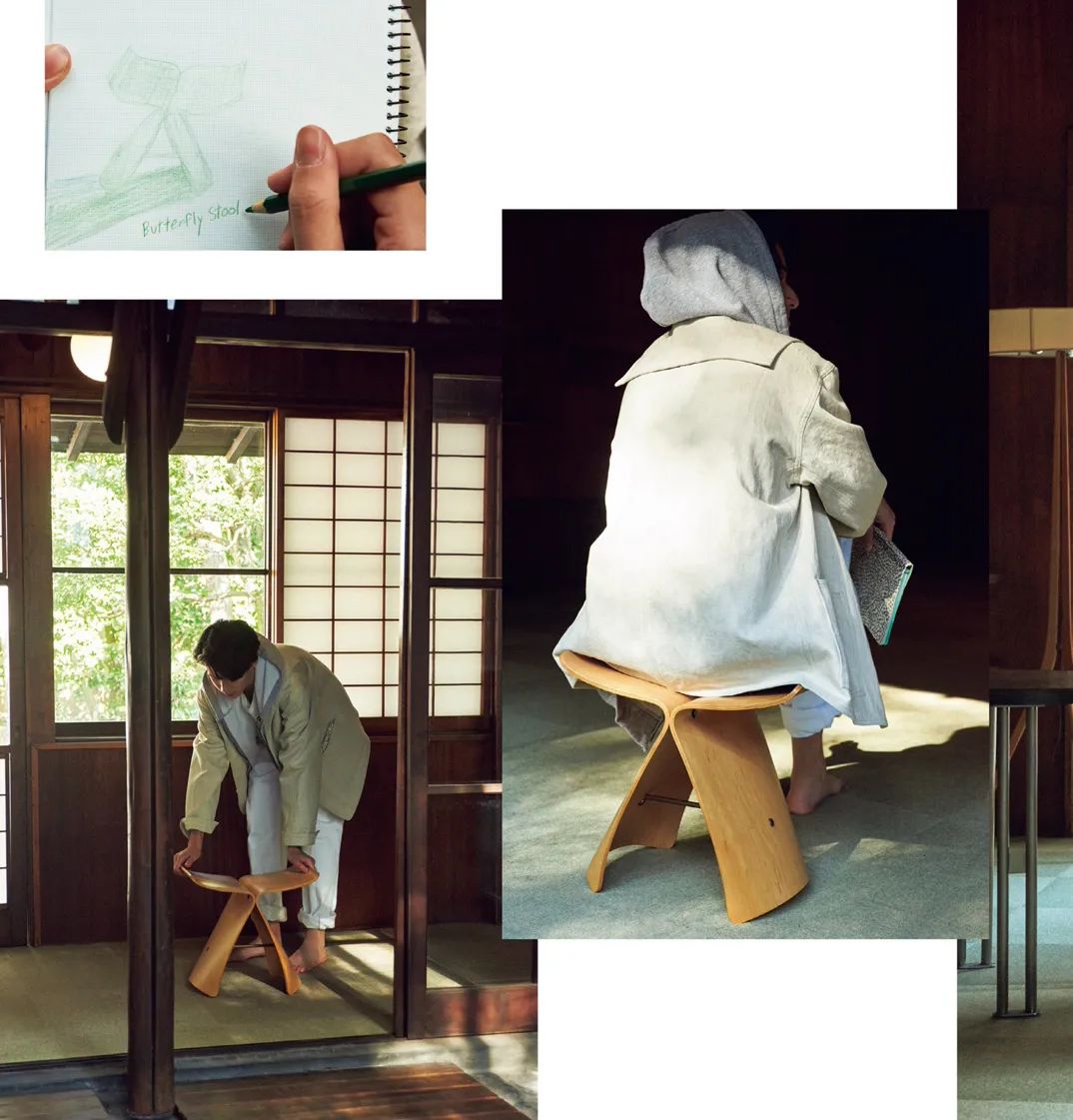 这一组以大师设计的凳子/椅子为主题,模特身着居家轻松的服饰,也是对主题进行呼应。帽衫在 OS衬衫和外套里面作内搭,常规操作就不多提,图1的衬衫来自印度马德拉斯格纹衬衫。