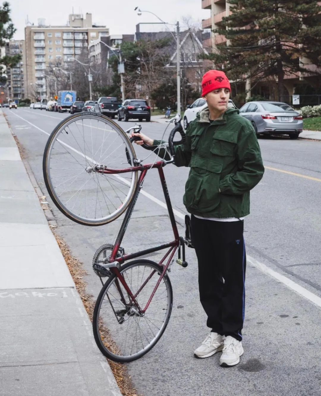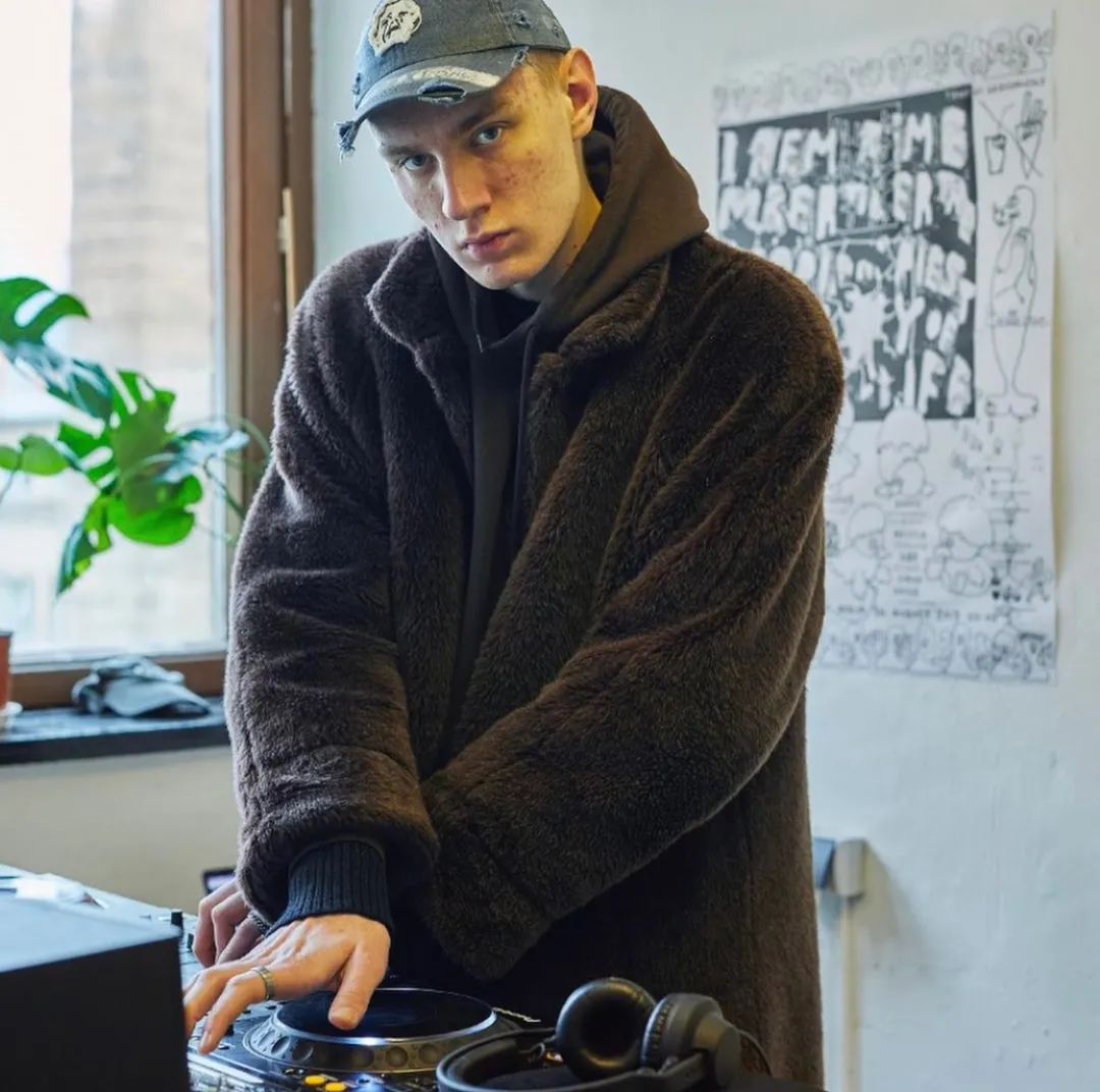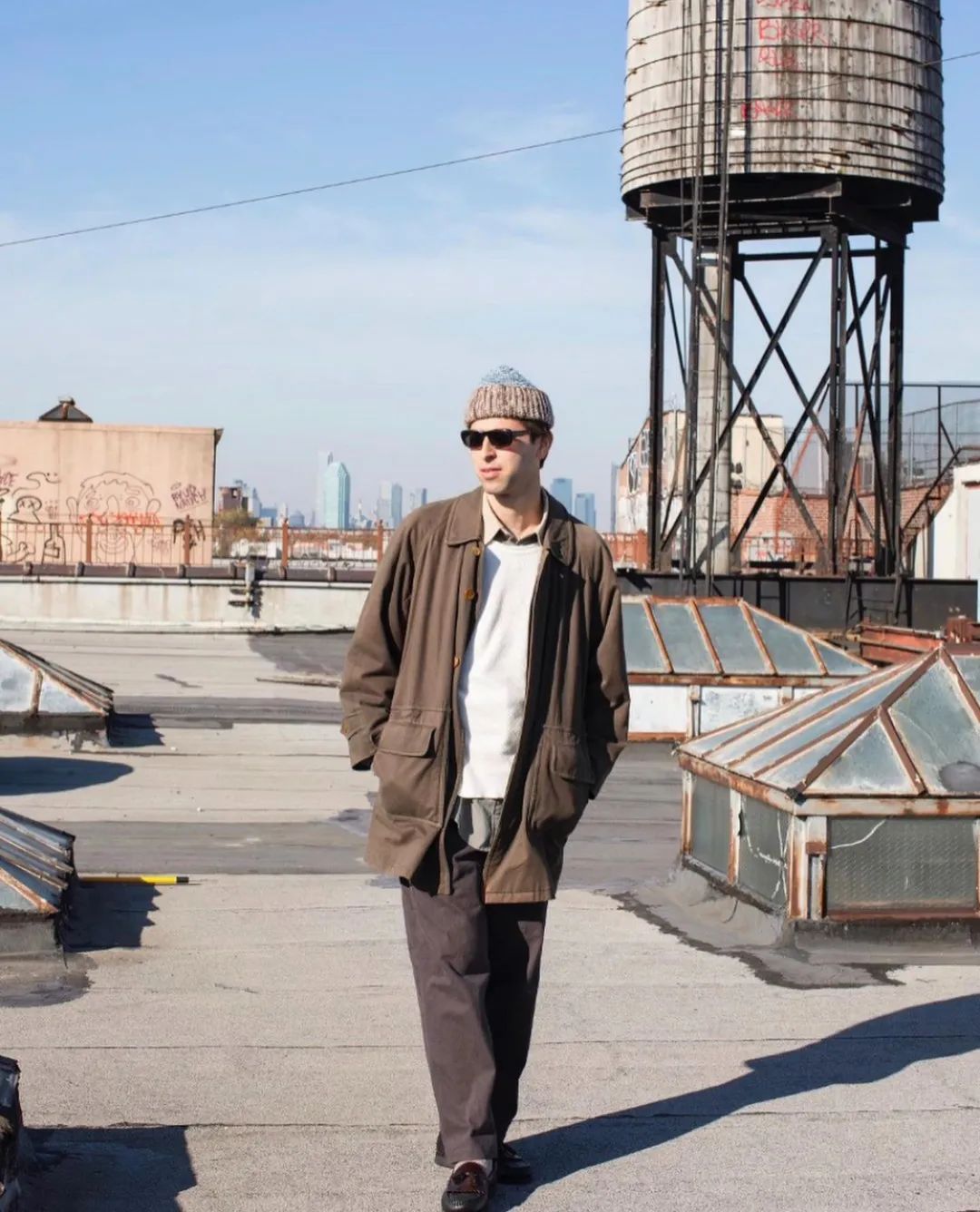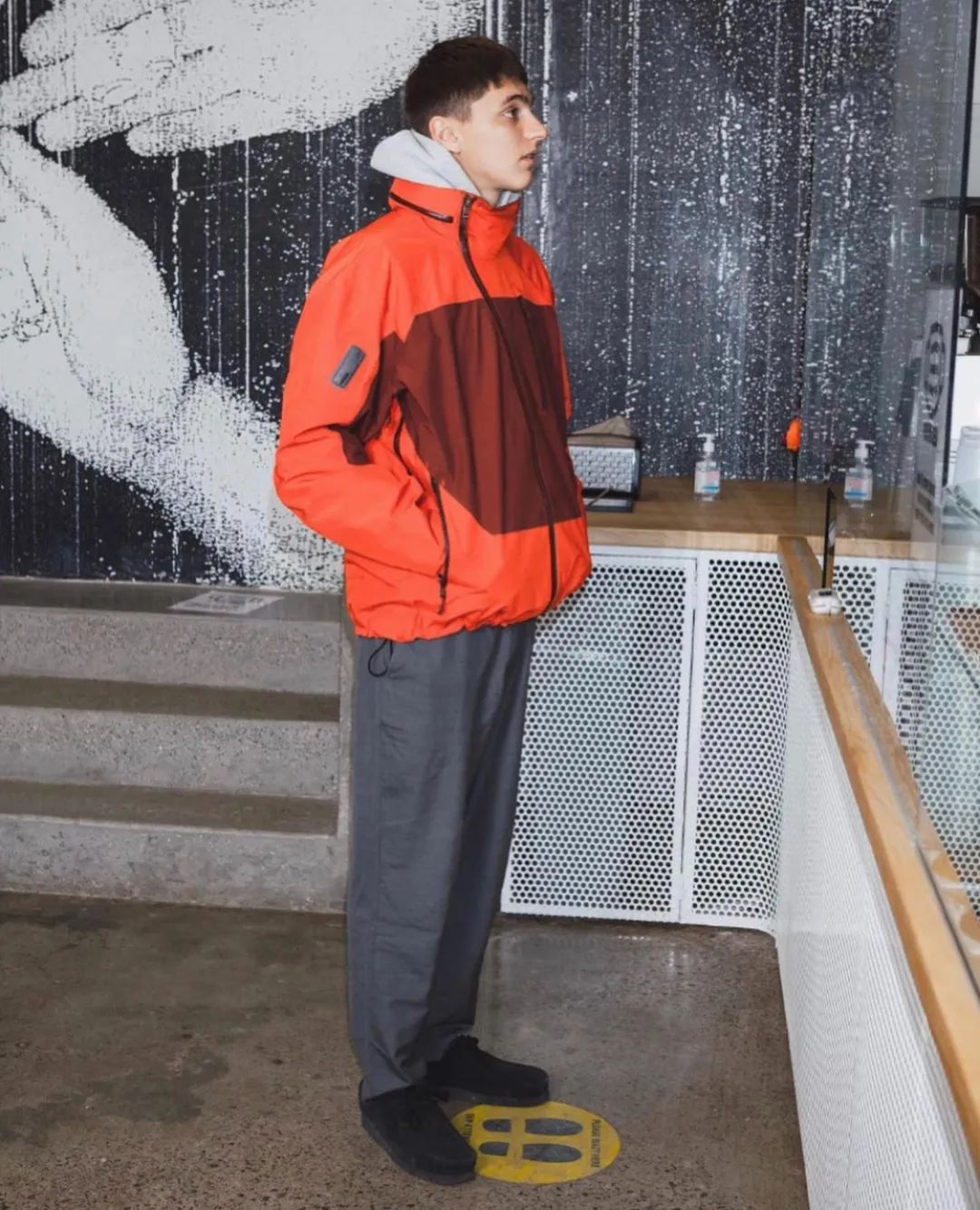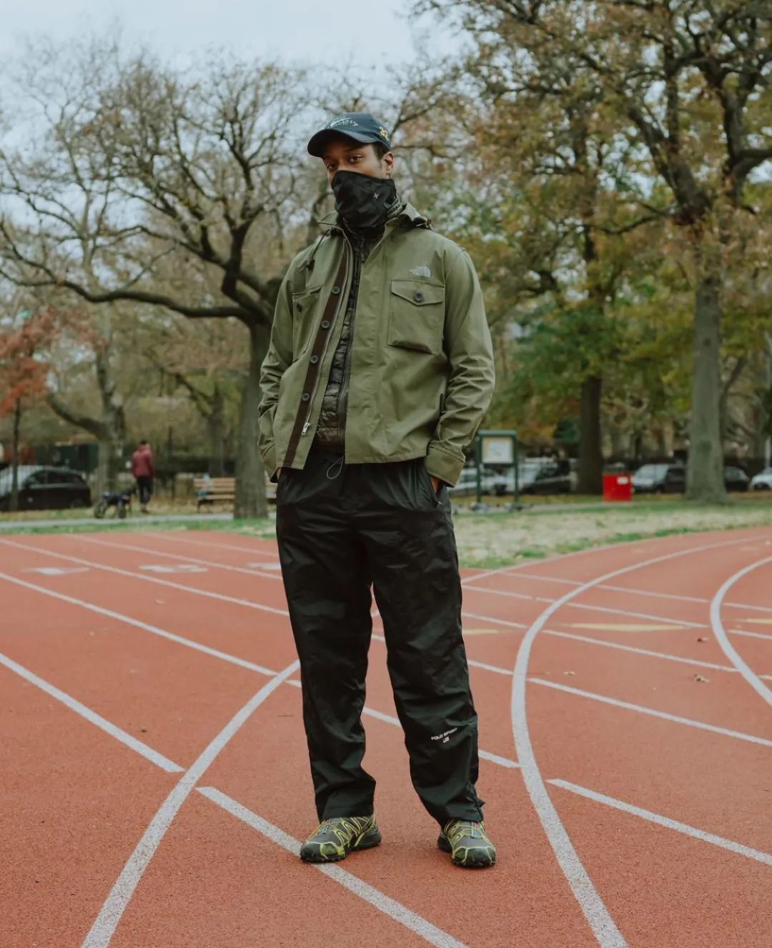 这一套颇具 90s 的味道,少见的荧光色高领搭配墨绿色圆领卫衣,落肩廓形呼应宽松 CK 尼龙裤,荧光绿的长袜搭配黑色沙漠靴,看似不搭调,冲突之下又合情合理。