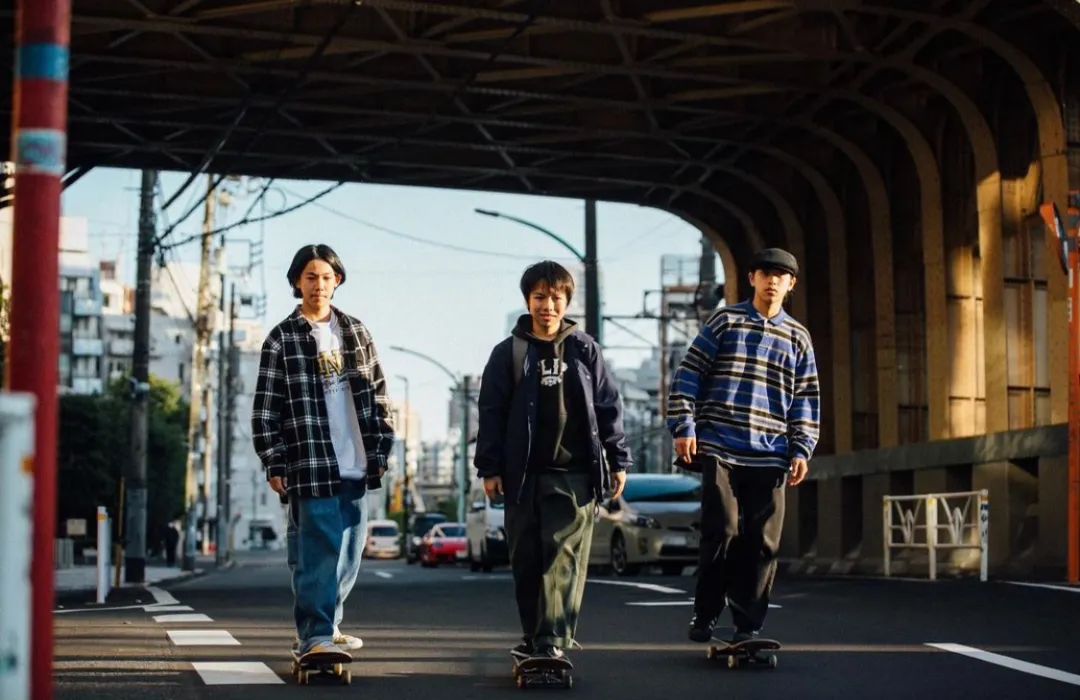 下图3个滑板少年,偏重基础造型,OS格纹衬衫、帽衫&夹克、宽松版型的长袖Polo,穿搭上都没啥难度,适合日常。