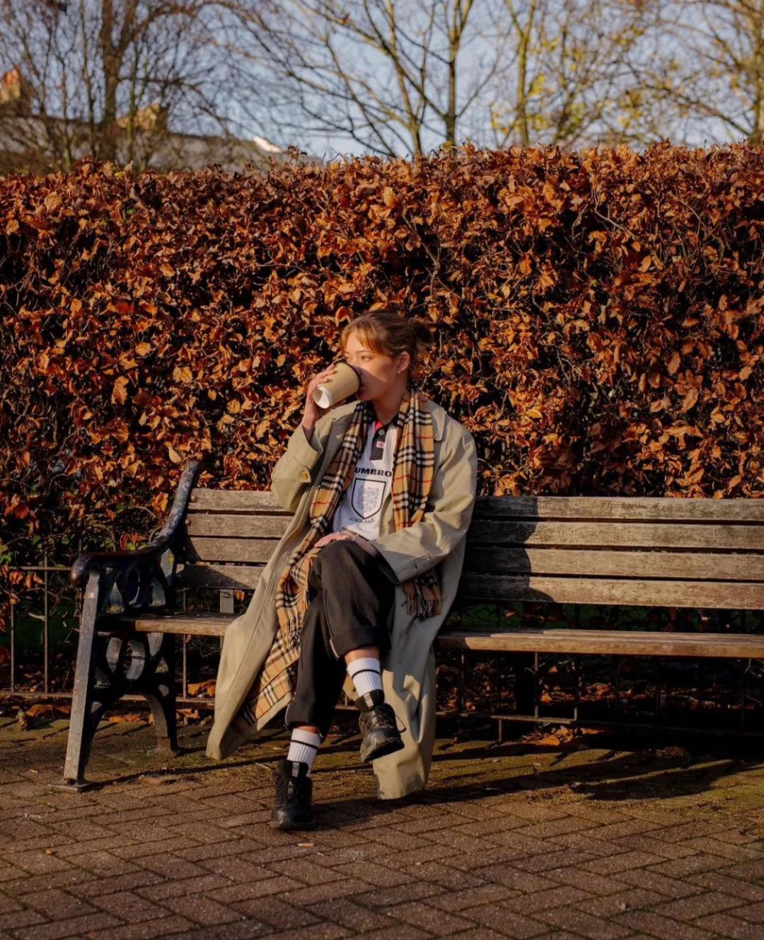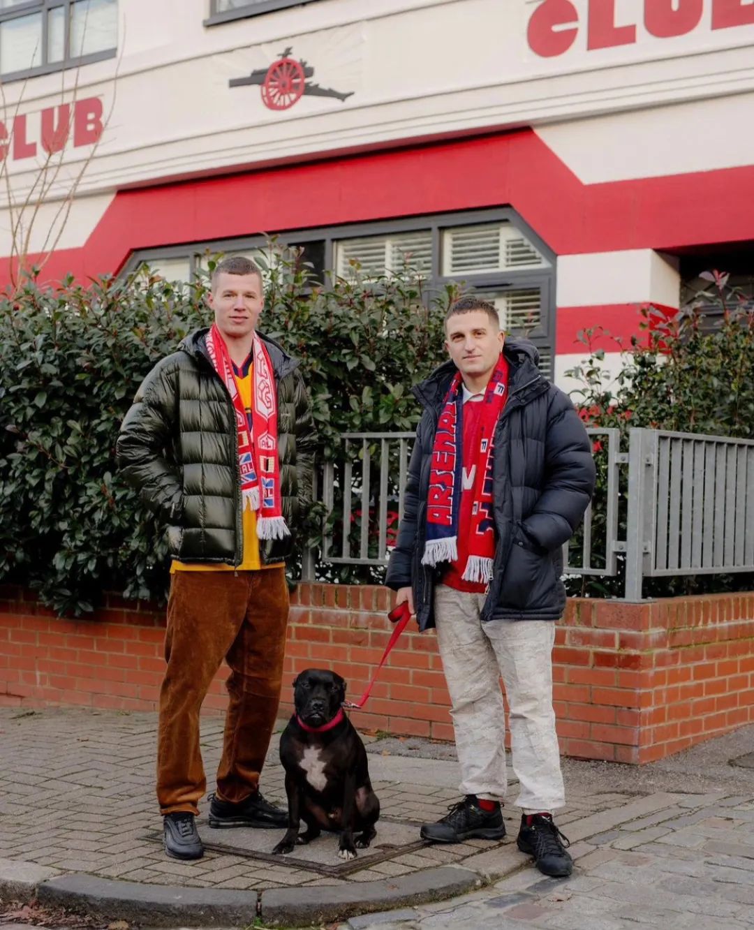 球衣+球迷围巾的组合,充满着街头运动气息。图一卡其风衣内搭球衣(England National Team),经典的 Burberry 围巾点缀,再加上 Dickies 长裤和 Salomon 鞋收尾,整体混搭,十分好看。图二羽绒服内搭球衣和球迷围巾,别有一番风味。