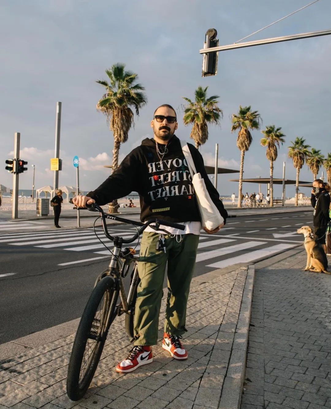 美国老牌运动品牌 Russell Athletic 的橙黄色运动衫,内搭 Lacoste 长袖Tee ,以及黑色尼龙裤,加之中长筒白袜对裤脚的处理,一双 Nike 复古运动鞋,轻松出街。