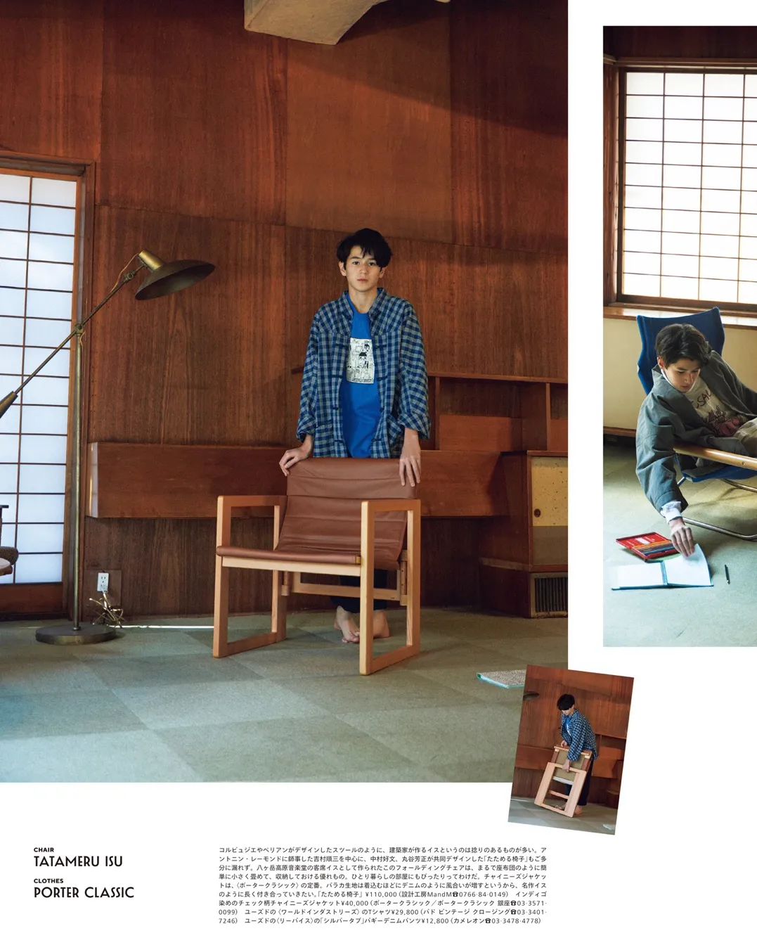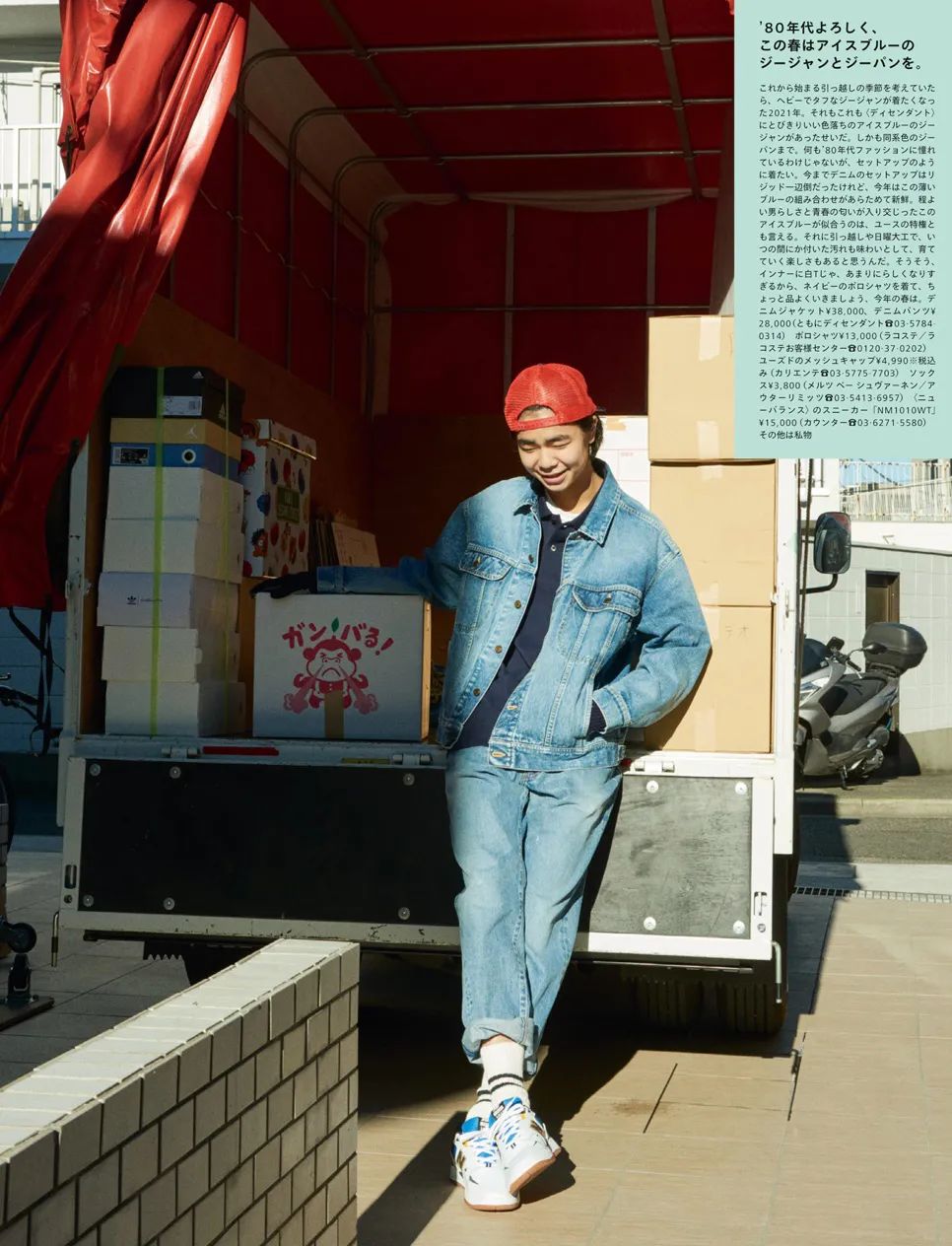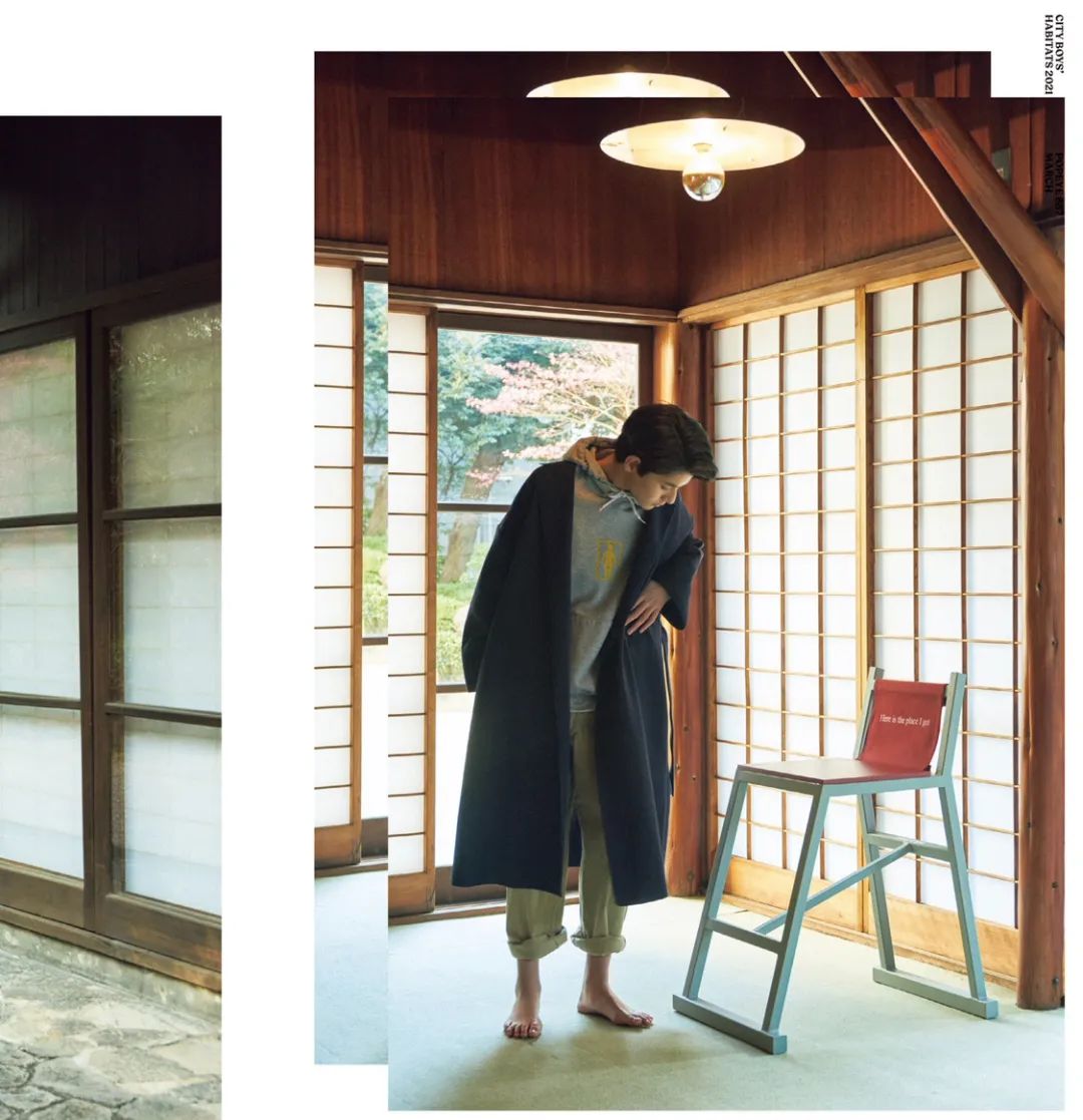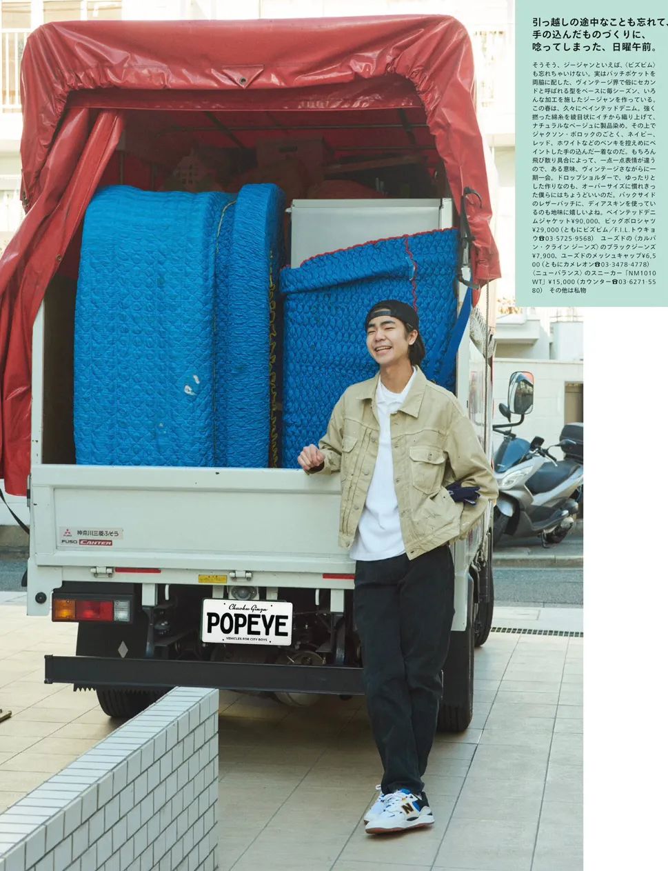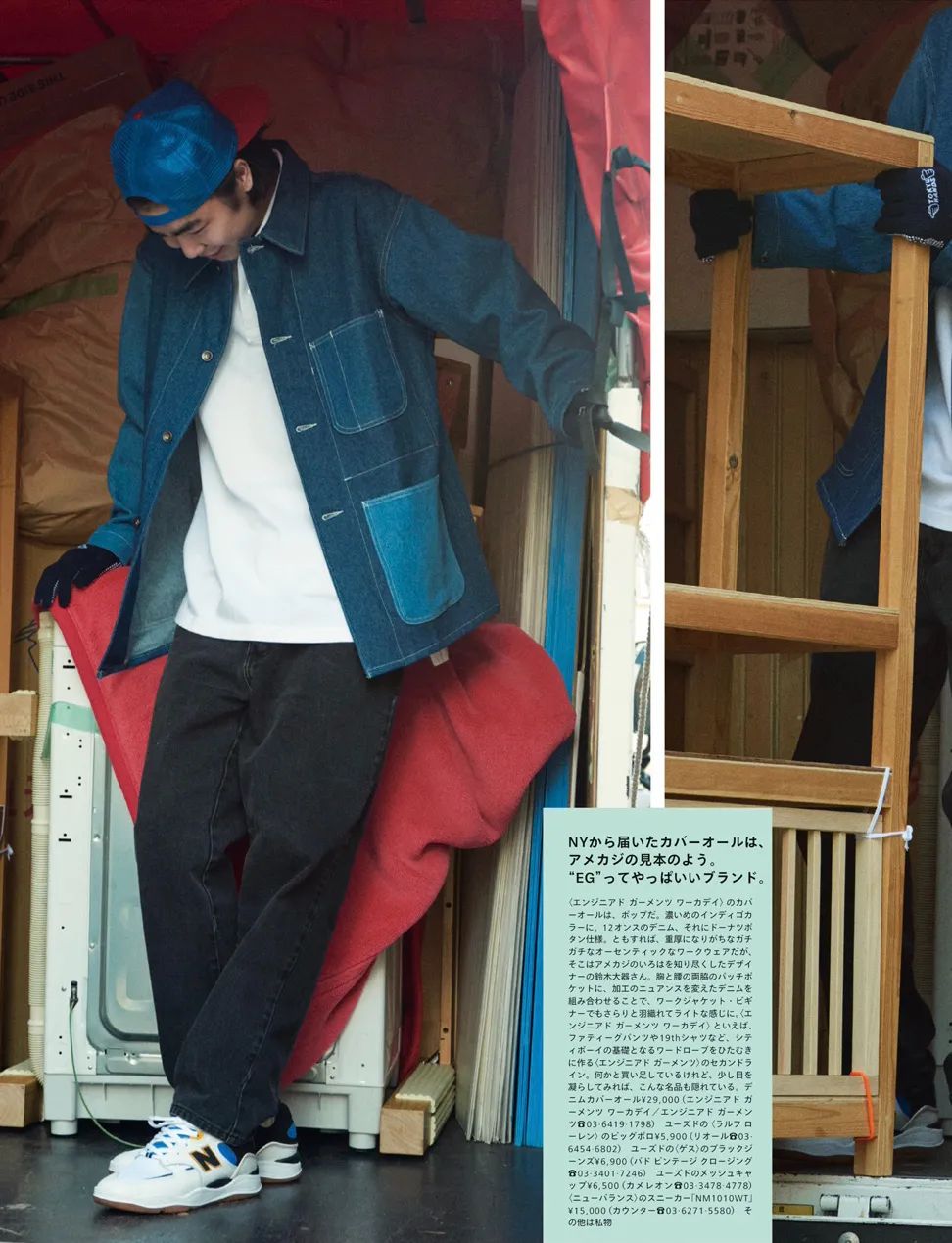 3月就是常规的「家居」刊,以居家生活展开相关话题。下图以搬家为场景,模特身着「牛仔夹克」和「工装外套」演绎了4个造型,整体中规中矩。图3工装外套来自 Engineered Garments,深浅拼接的设计加上硬挺的材质,充满着纯正的美式气息,上身效果不错。