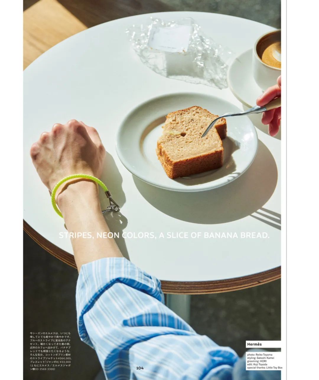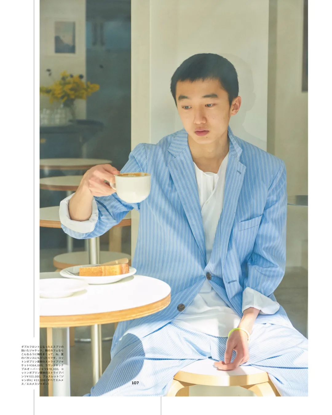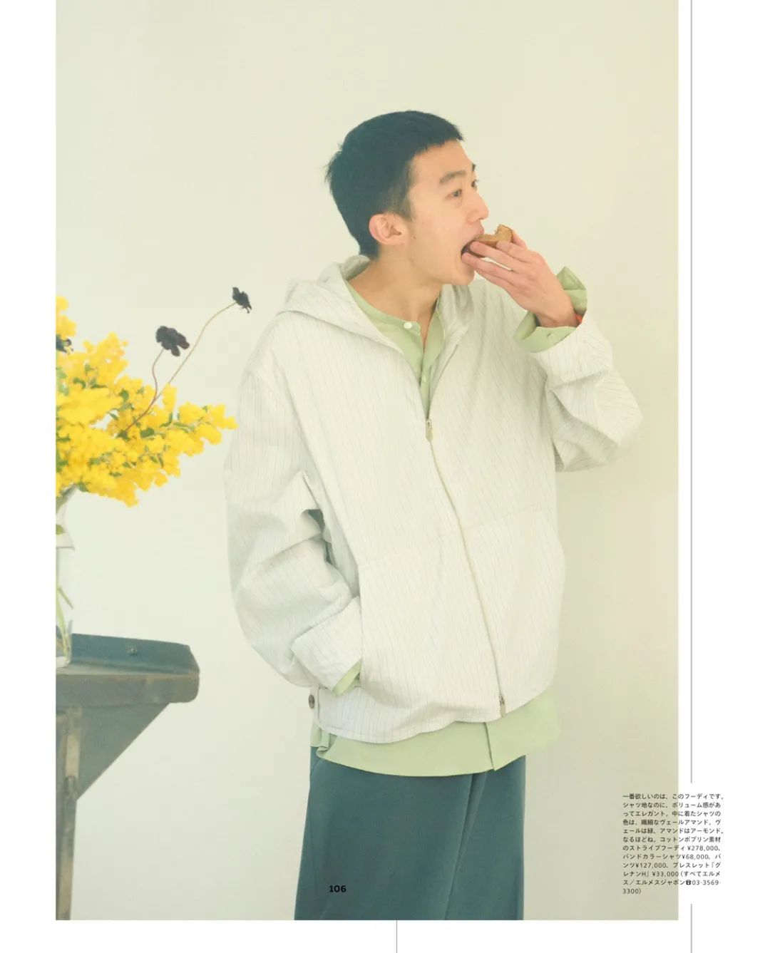 这一组 Hermès 单品的演绎,充满春日气息,不管是浅蓝色条纹衬衫、套装还是灰白色条纹和苹果绿&荧光黄的搭配,都十分随意和谐。