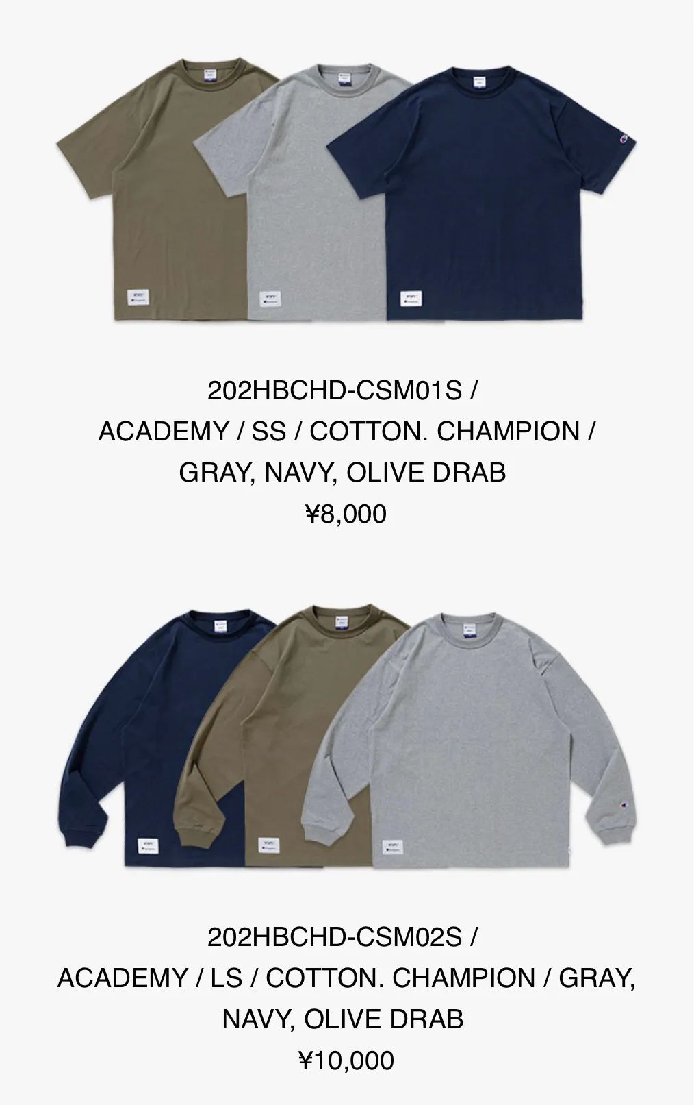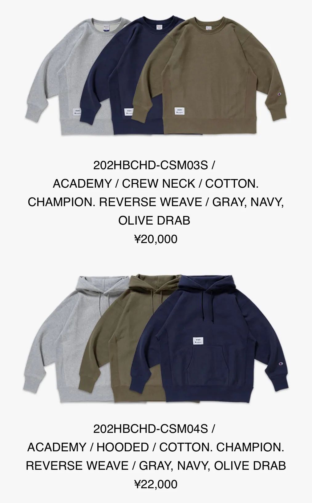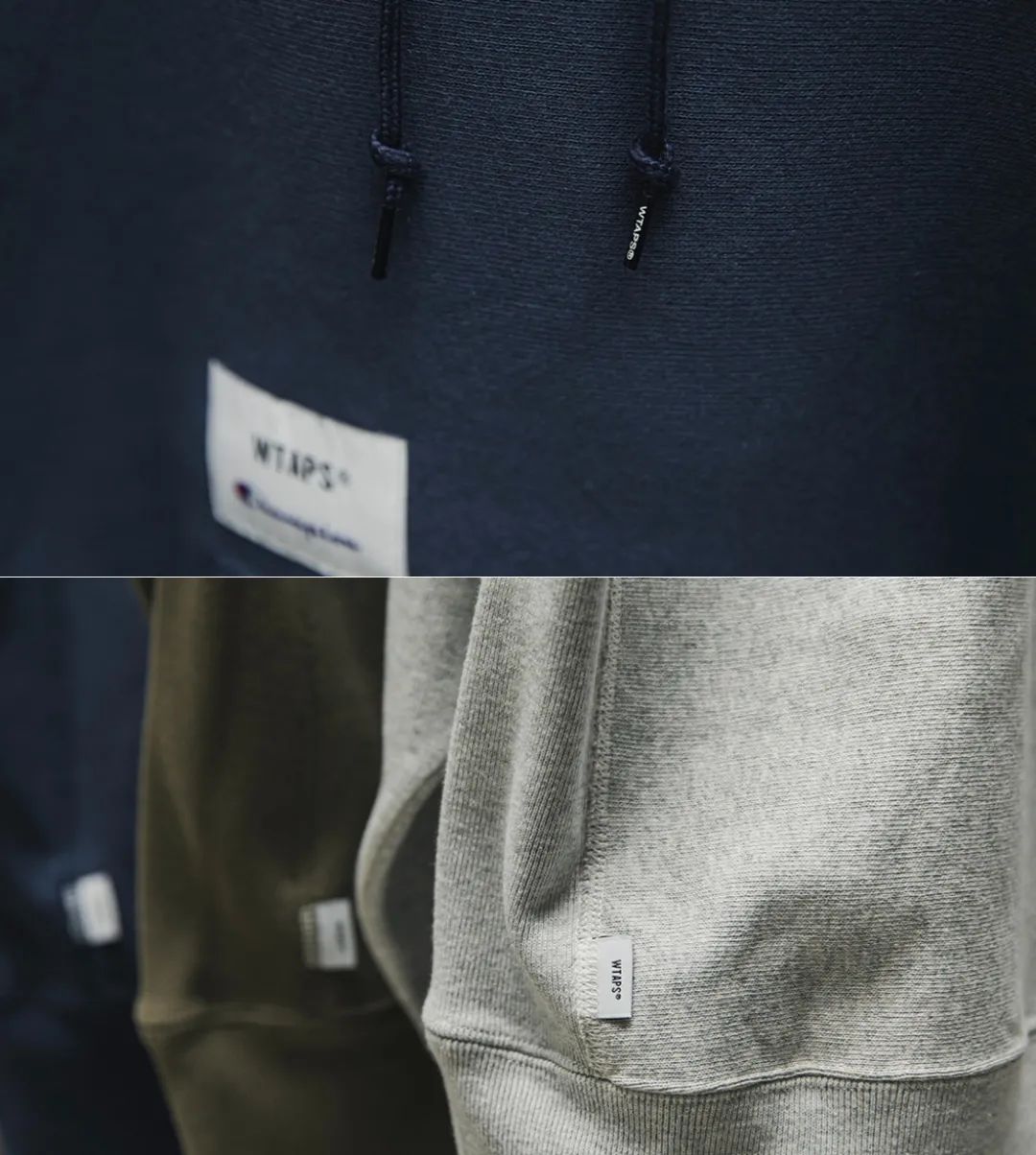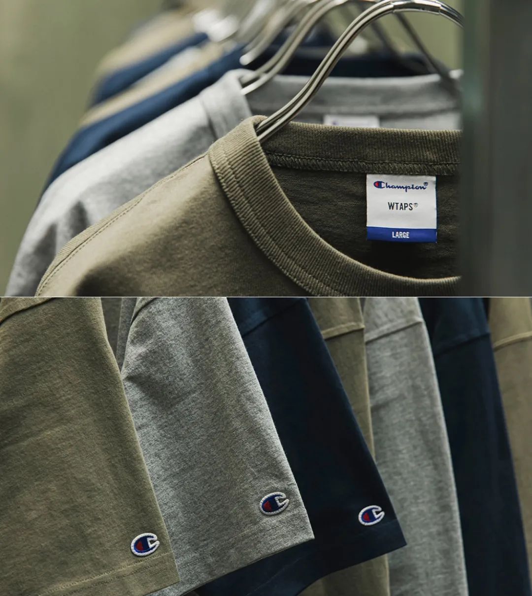 这里重点说一下,No.17 的 Wtaps x Champion 的联名系列,此次合作带来了包括短袖Tee、长袖Tee、圆领卫衣、帽衫,共计4款单品,以橄榄绿、海军蓝、灰色为主打色,十分百搭。