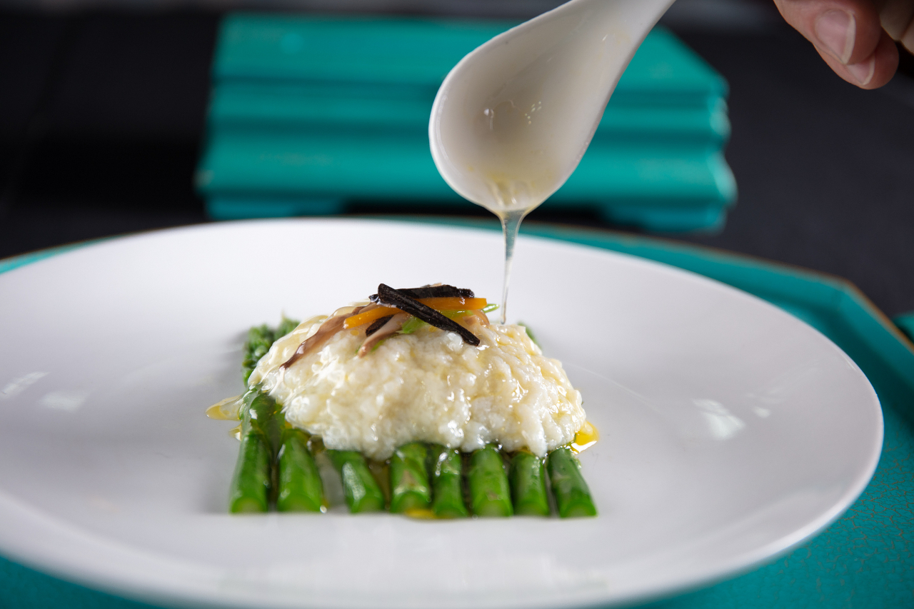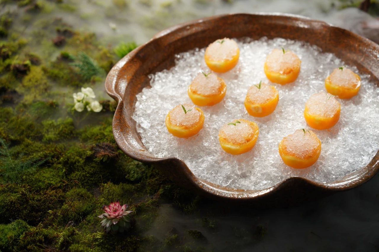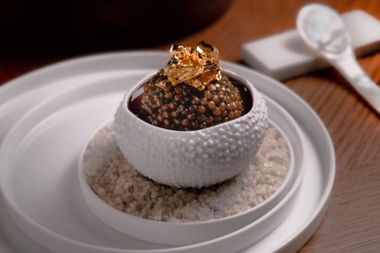将龙虾提炼成果冻状, 配搭上鱼子酱与鲜甜的赤海胆,不仅层次丰富,更将各种鲜味完美结合。自2019年起,这道菜随着Amber的概念升级而重新演绎,彰显出经典菜品也需与时俱进的前沿思想。