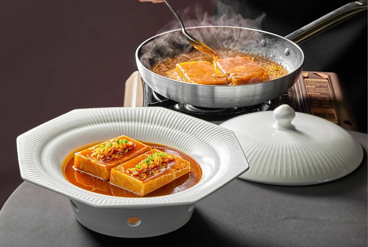 选用荔浦芋头的精华部位,加红烧肉长时间慢炖,配上闽南干葱酥,每一口都能感受葱香,肉香与芋头香。成功将常见的食材进行精细化表达,又克服了种种难度做到出品稳定,保证每块芋头同样酥烂。