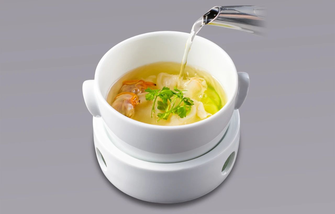 汤品选取台州黑蛤蜊,与清鸡汤同煮,鸡鲜贝鲜互补。汤色清透,鲜度极高。所有食材都经过细微推敲,汤品精心的设计为食客带来多层次的细腻体验,体现出潮菜至真至细的味觉审美。