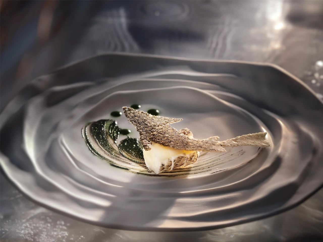 在当地传统风味基础上,用现代的烹饪手法低温慢煮而成,佐以绘成海浪的酱汁,点缀鱼形脆片,栩栩如生。大胆地解构重组传统菜,却不失潮菜本质,外观契合现代国风审美,展现了创新与传统的和谐结合。