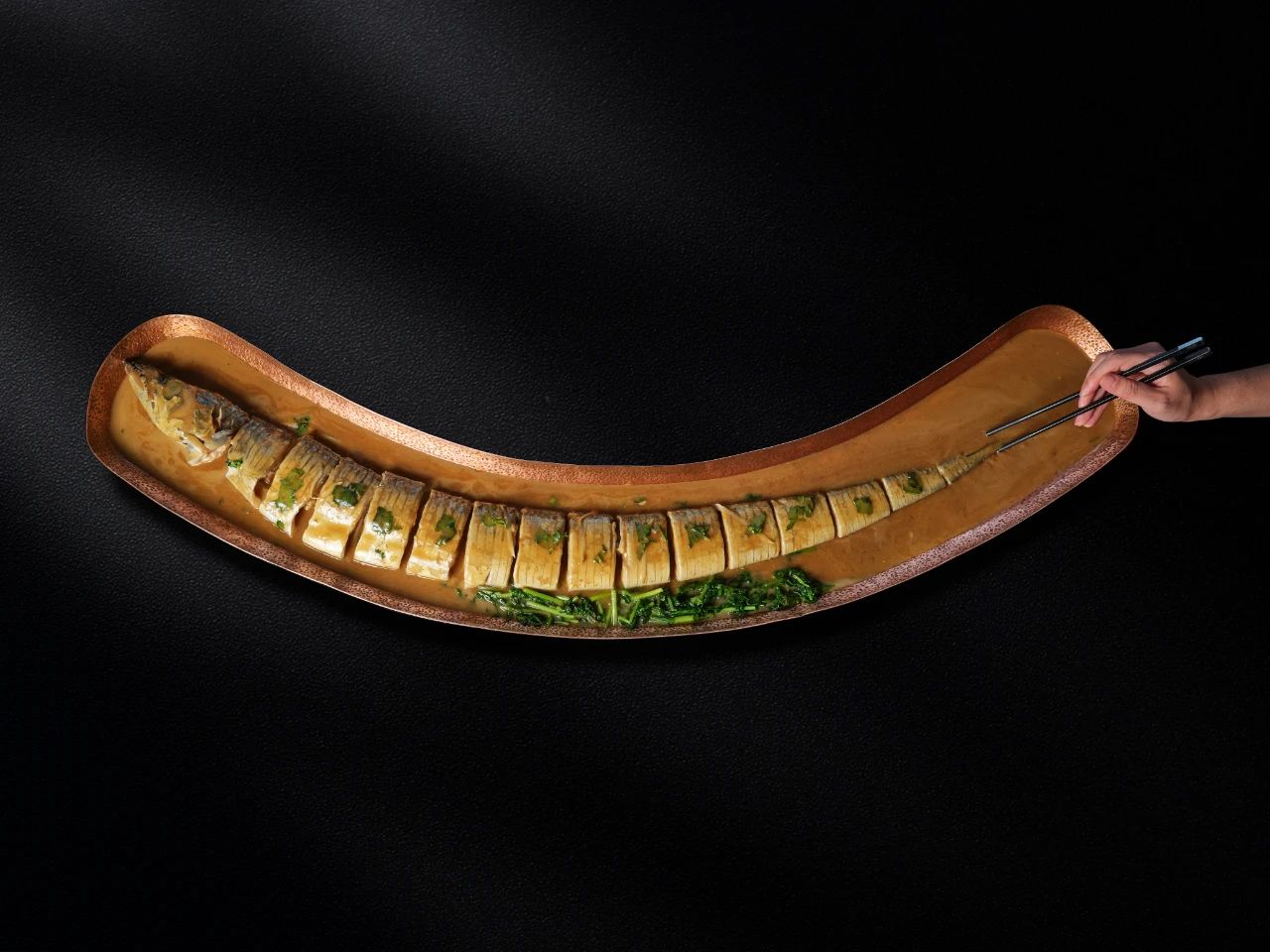 胶东大刀鱼以其肉质细嫩而闻名,经过传统的胶东酱焖做法,精选的大刀鱼肉质饱满且富有油脂,兼具口感与颜值。这道菜的定制餐盘有极强的视觉辨识度,与大刀鱼的弧形相契合,引领了摆盘和器具的风潮。
