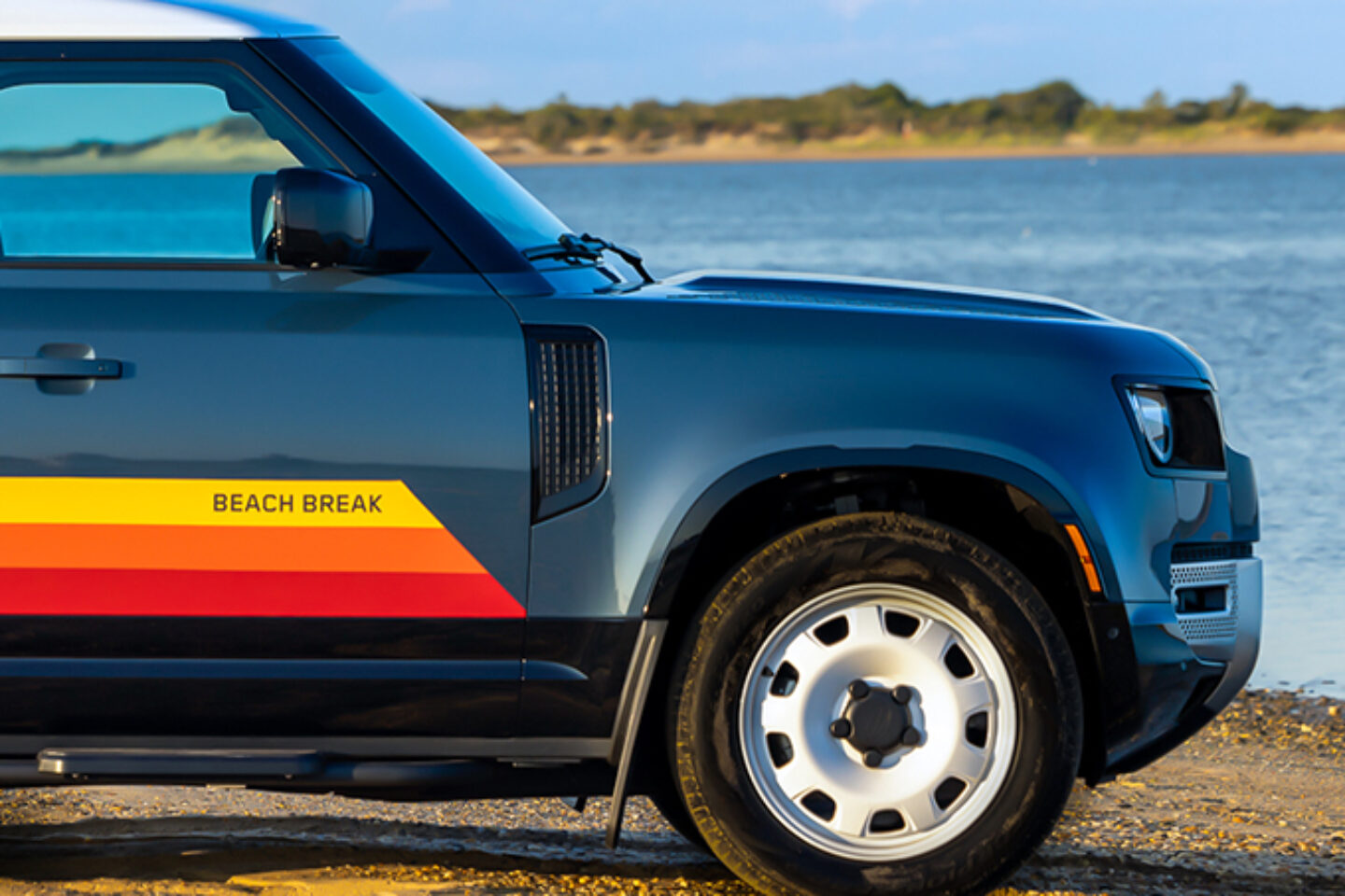 搭载一套白色 20 英寸 “Steelies” 铝制全地形轮胎,Beach Break 与普通 Defenders 车型的主要区别在于视觉细节。其美学体系采用 Tasman Blue 喷漆,旨在与白色光泽轮毂和白色车顶形成鲜明对比,蓝色涂装还与装饰车门的车型专属红橙黄条纹图案形成鲜明对比。Beach Break 字样与条纹图案相得益彰,后挡板还配有 Beach Break 1/20 徽章,以强调该车型仅有 20 部的事实。