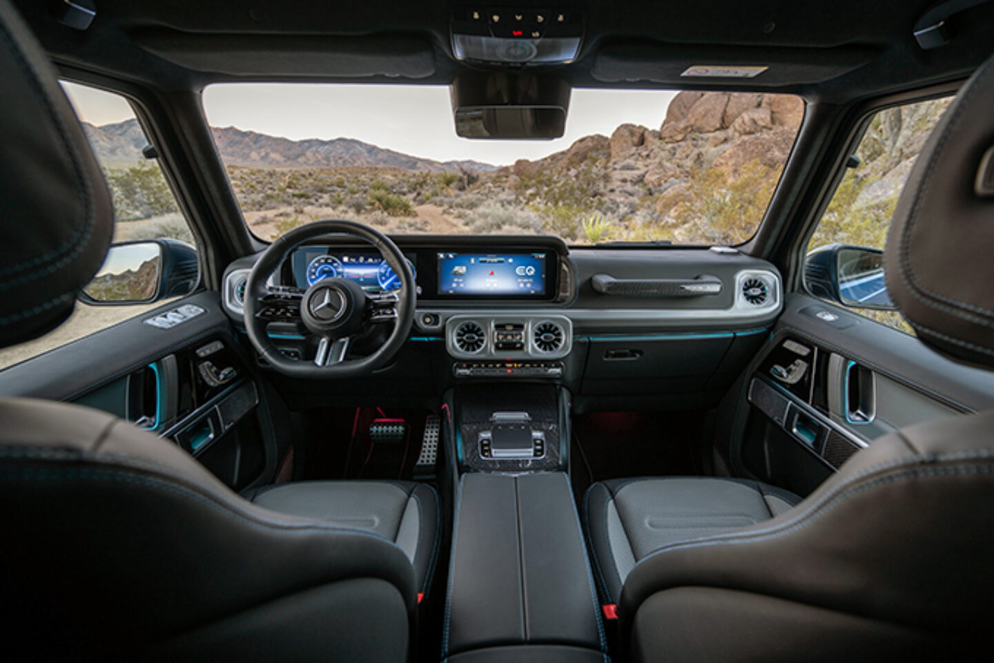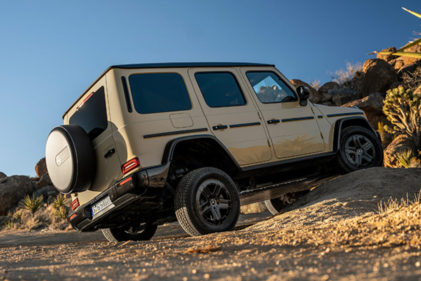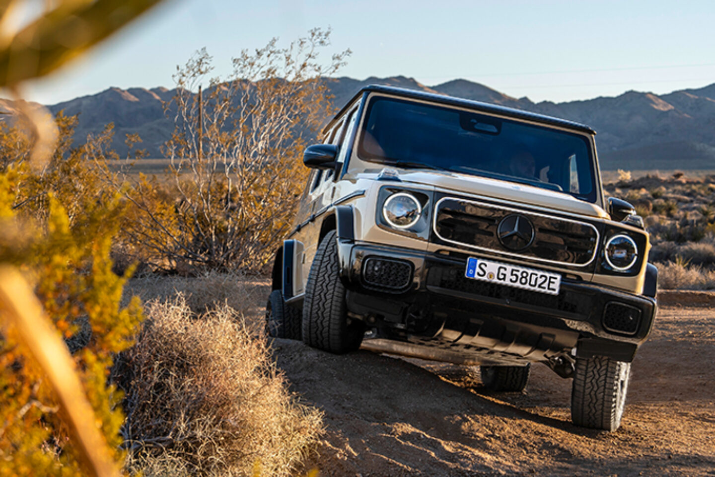 EV G-Wagen 围绕先进且坚韧的梯架构建而成,配备独立双横臂前悬架,搭配刚性实心后轴。其全地形能力可圈可点:离地间隙 9.8 英寸、涉水深度高达 33.5 英寸、侧坡爬坡能力高达 35°、爬坡能力接近 100% ,此外,接近角、通过角和离去角分别为 32° 、 20.3° 和 30.7° 。为 G 580 提供动力的是四个独立控制的永磁同步两速电机,可向全轮驱动系统发送 579 马力和 859 英尺磅的瞬时扭矩。该动力系统采用 116 千瓦时的锂离子电池组,每次充电可行驶 293 英里,最高时速可达 112 英里/小时,从 0 加速至 60 英里/小时仅 4.6 秒。