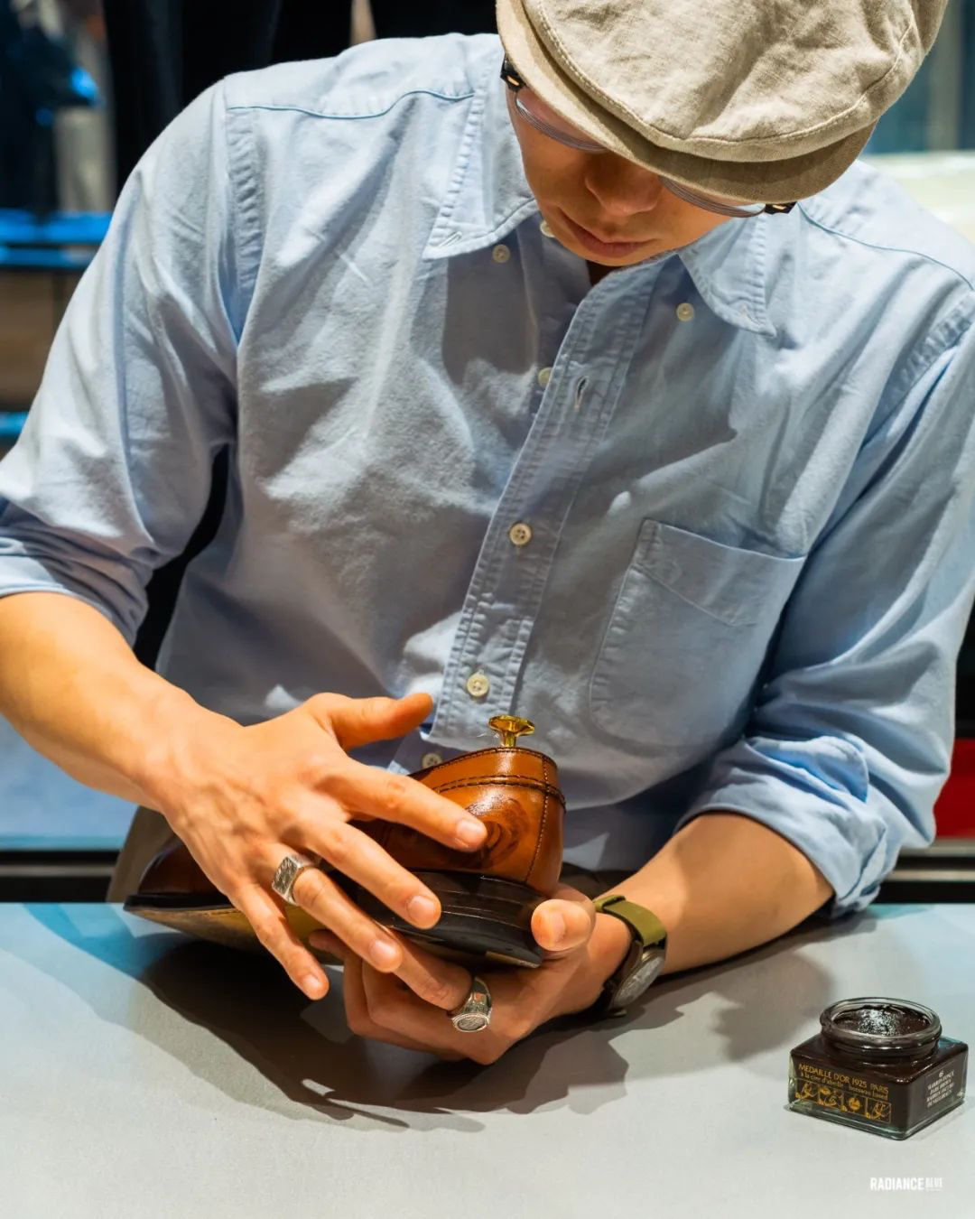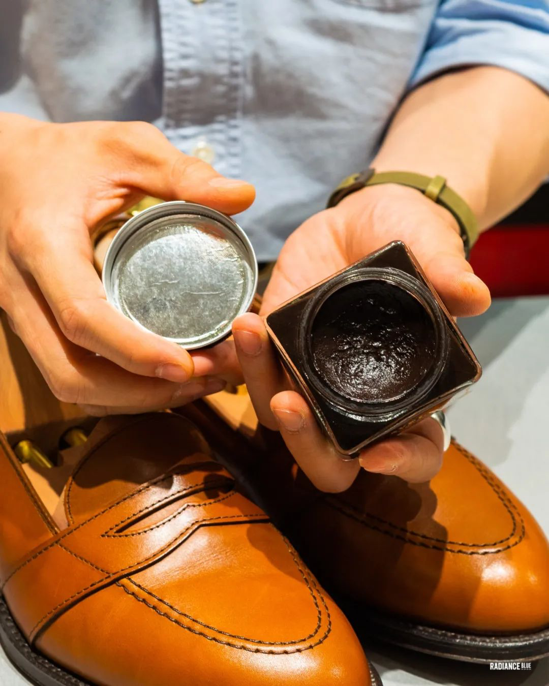 Tan色,一种较皮革原色略深的浅棕,多见于英式正装鞋履,近年在复古鞋靴圈也颇具人气。因多数鞋靴制造商在制鞋过程中不会花费过多时间在后处理步骤上,所以Tan色的鞋履在大家新鞋到手时总会纳闷为什么同样的款式和INS上那些富有晕度的漂亮的照片有区别呢,看起来平平的,也没什么颜色起伏,光泽度也不够。多数朋友以为自己交了学费懊恼不已,从此再不相信照片。实则只需简单几步便能把鞋子处理成我们想要的样子。